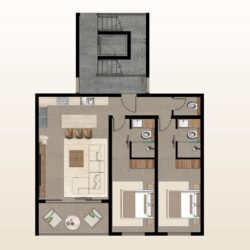 - Chambres : 2 chambres spacieuses de 19,7 m² chacune avec salle de bain attenante, assurant confort et intimité.