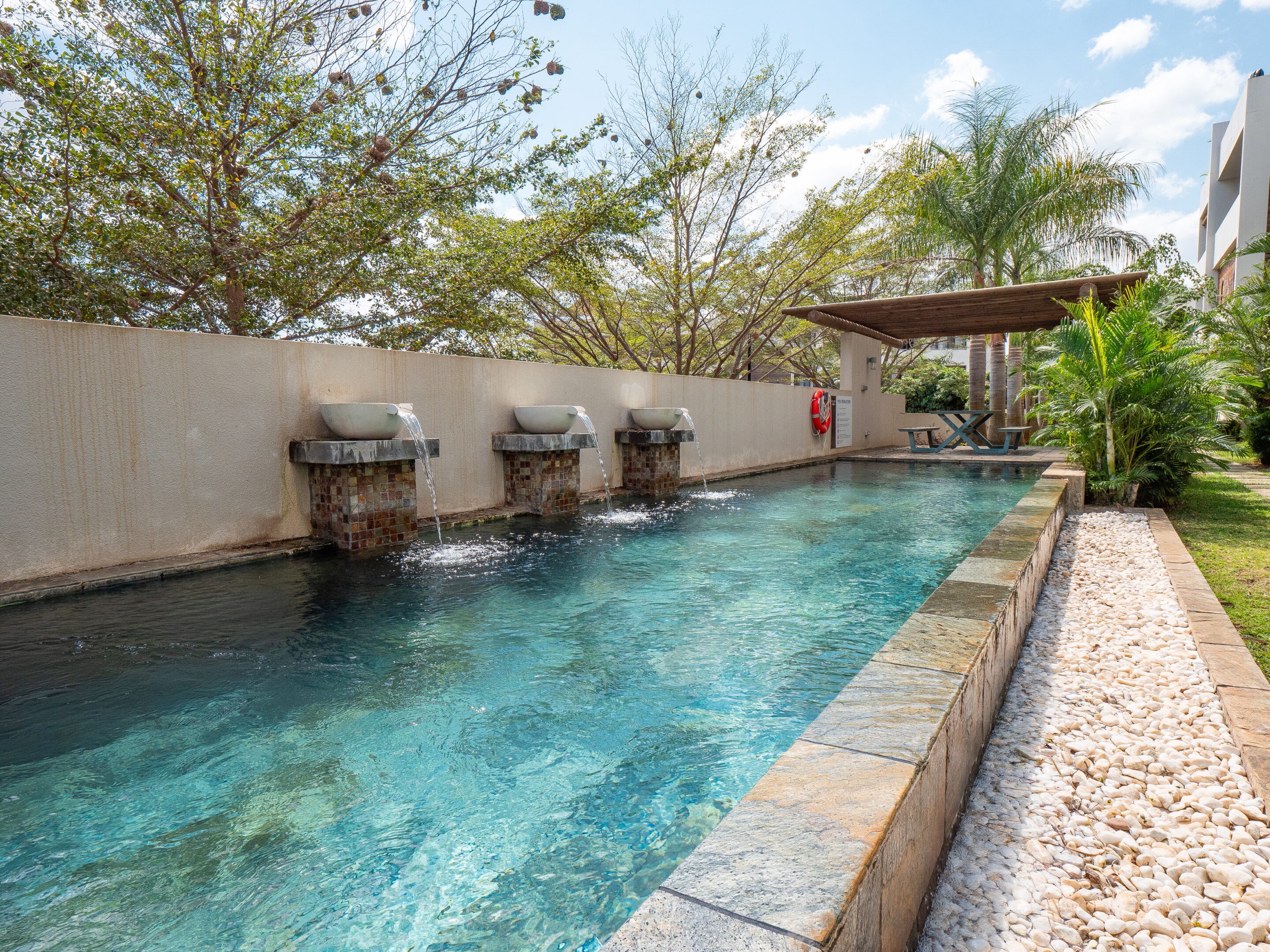 - Its magnificent communal swimming pool in lava stone