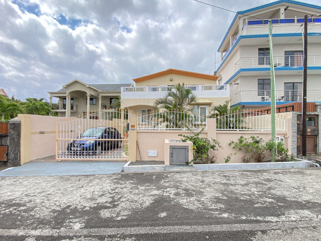 Maison à louer dans le lotissement sécurisé Les Jardins d’Anna à Flic en Flac. Spacieuse, avec vue mer, piscine et double accès, proche des plages et commodités.