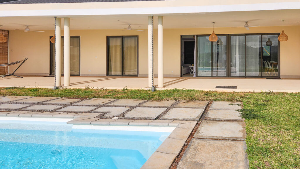 Maison spacieuse à louer à Wolmar, Flic en Flac. À deux pas de la plage, avec piscine privée et terrasses. Quartier calme, location long terme, animaux acceptés.