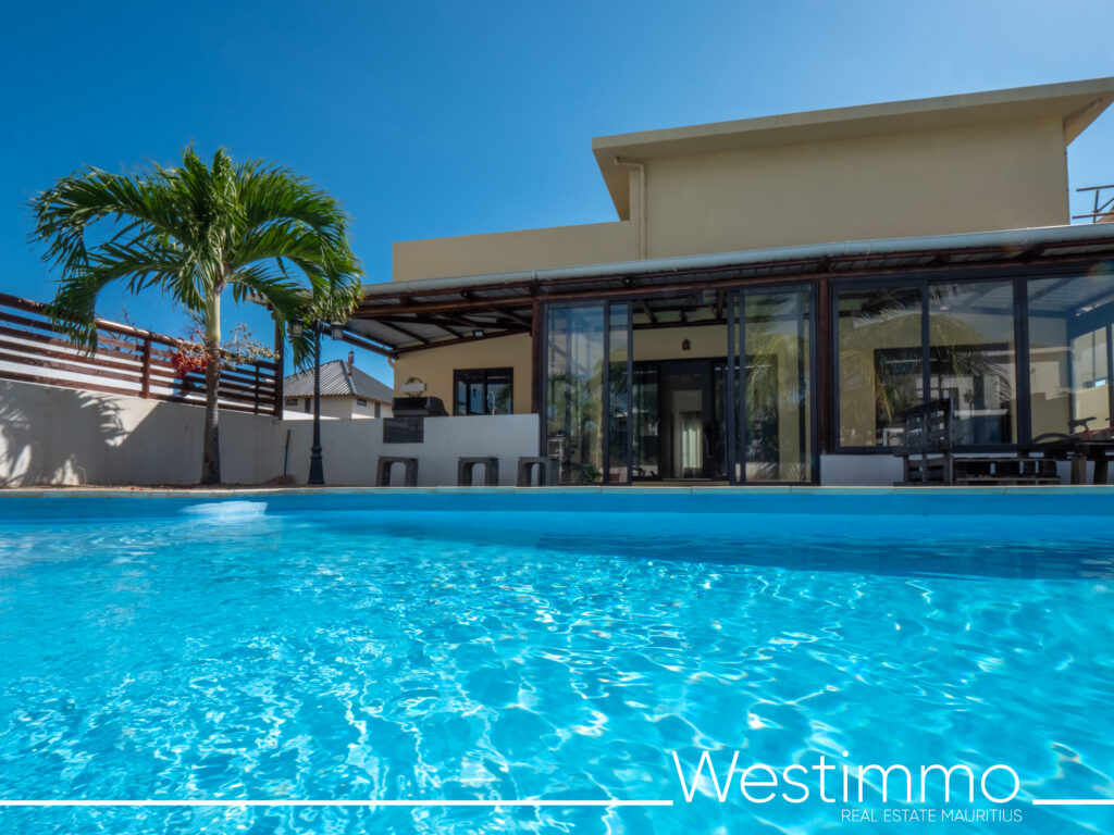 TAMARIN – Maison plain pied de 3 chambres à vendre avec jardin et piscine dans un quartier résidentiel très prisé de Tamarin, ile Maurice.