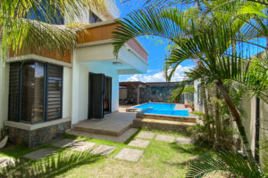 Maison à louer dans le lotissement sécurisé Les Jardins d’Anna à Flic en Flac. Spacieuse, avec vue mer, piscine et double accès, proche des plages et commodités.