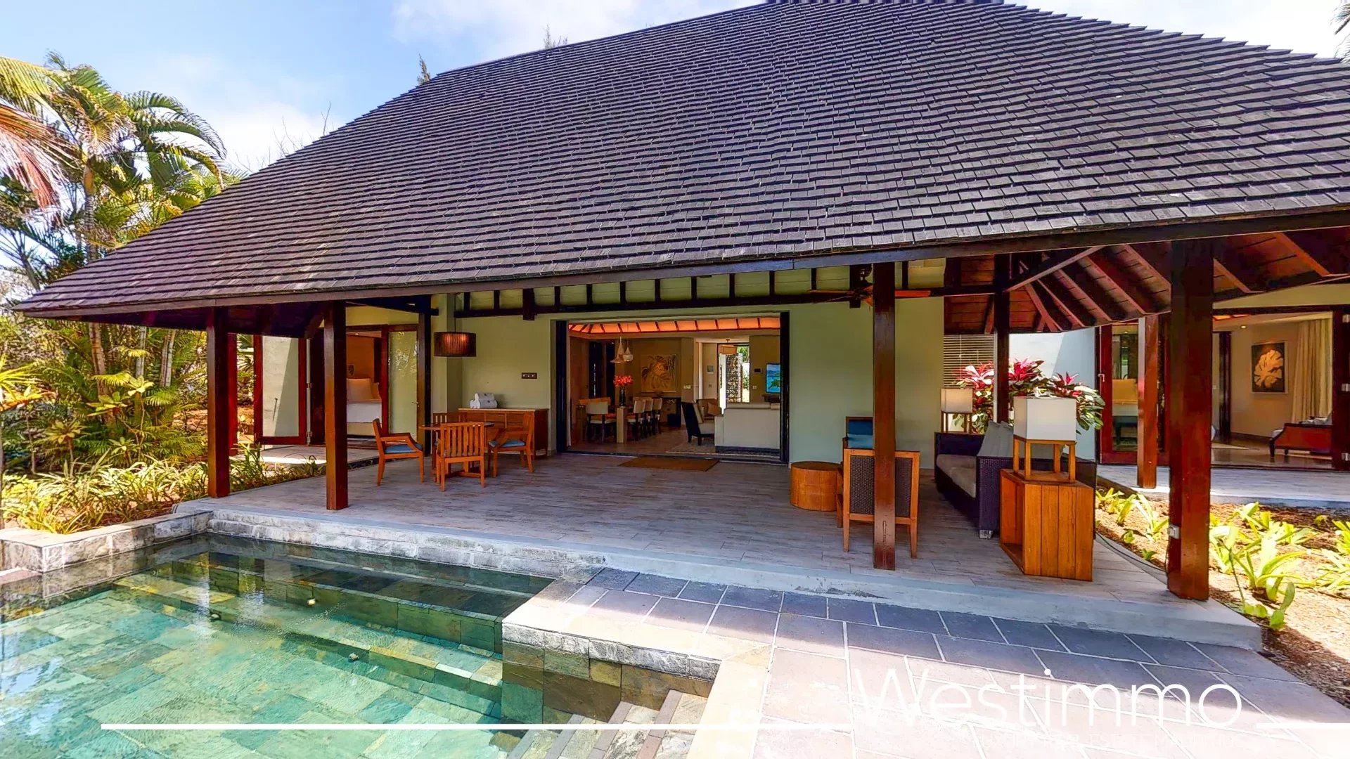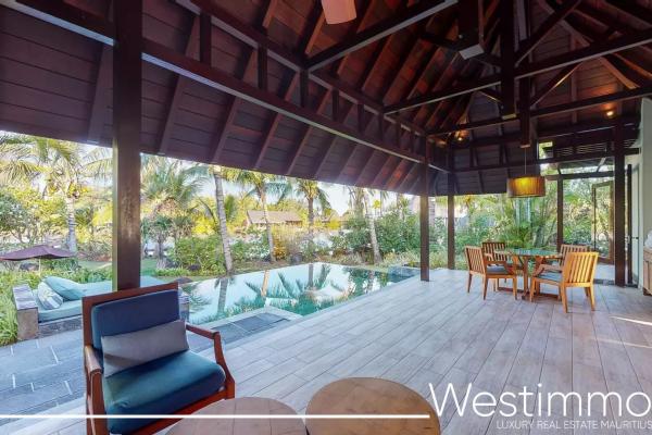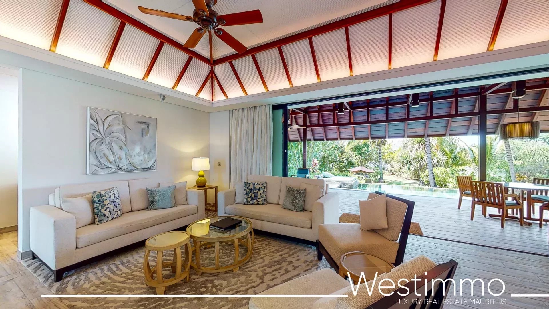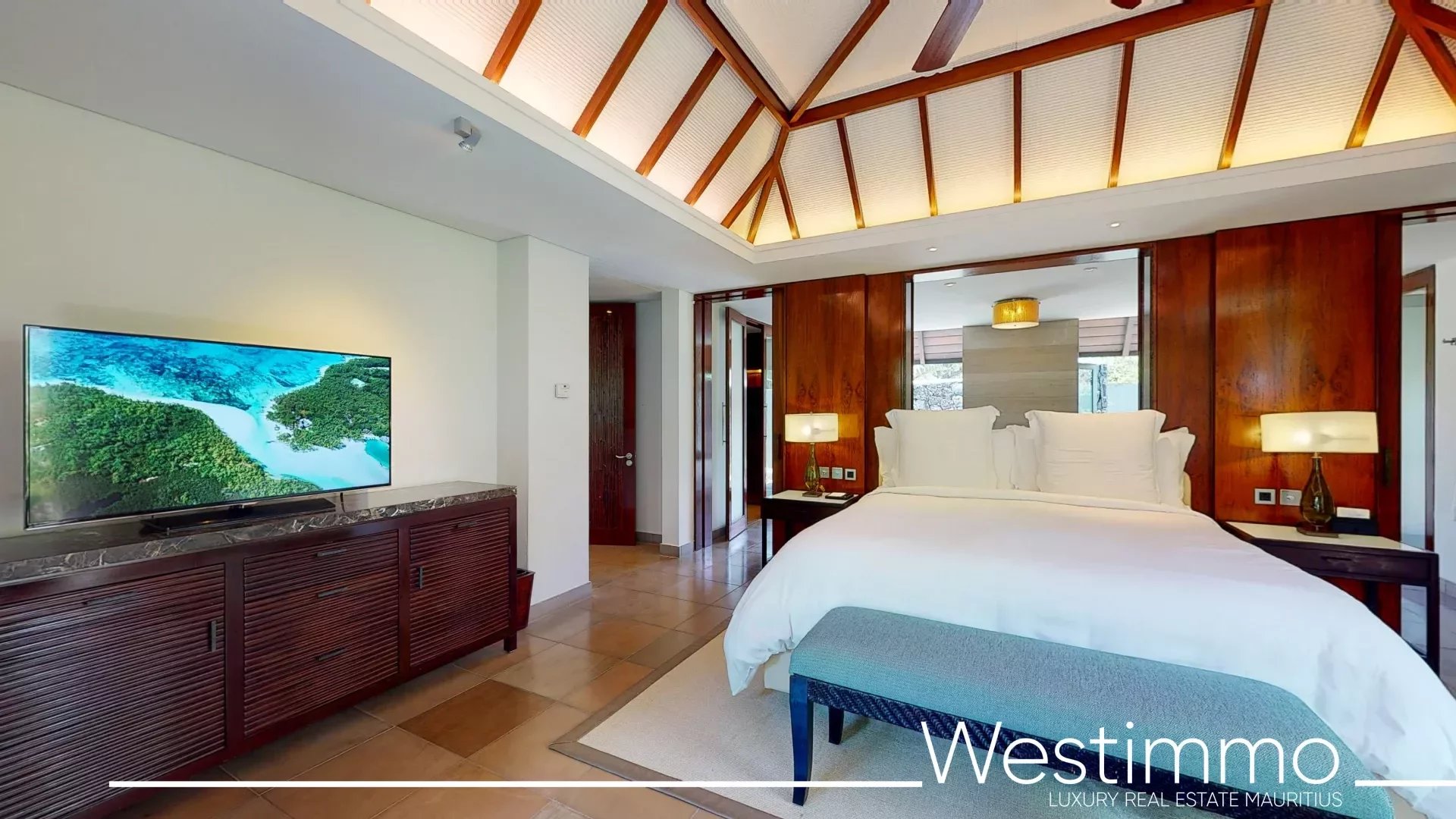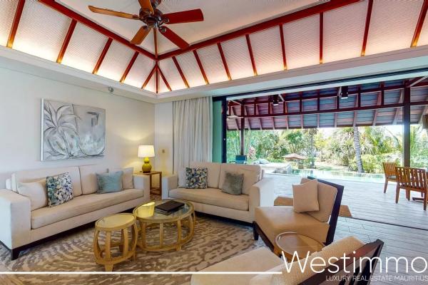 Elle se compose de deux chambres spacieuses avec salles de bains attenantes, décorées dans un style chic et contemporain. Le grand salon, baigné de lumière naturelle, s’ouvre sur une vaste terrasse couverte, idéale pour des moments de détente en famille ou entre amis, tout en profitant d’une vue imprenable sur le lagon turquoise.