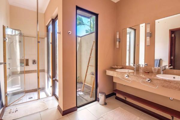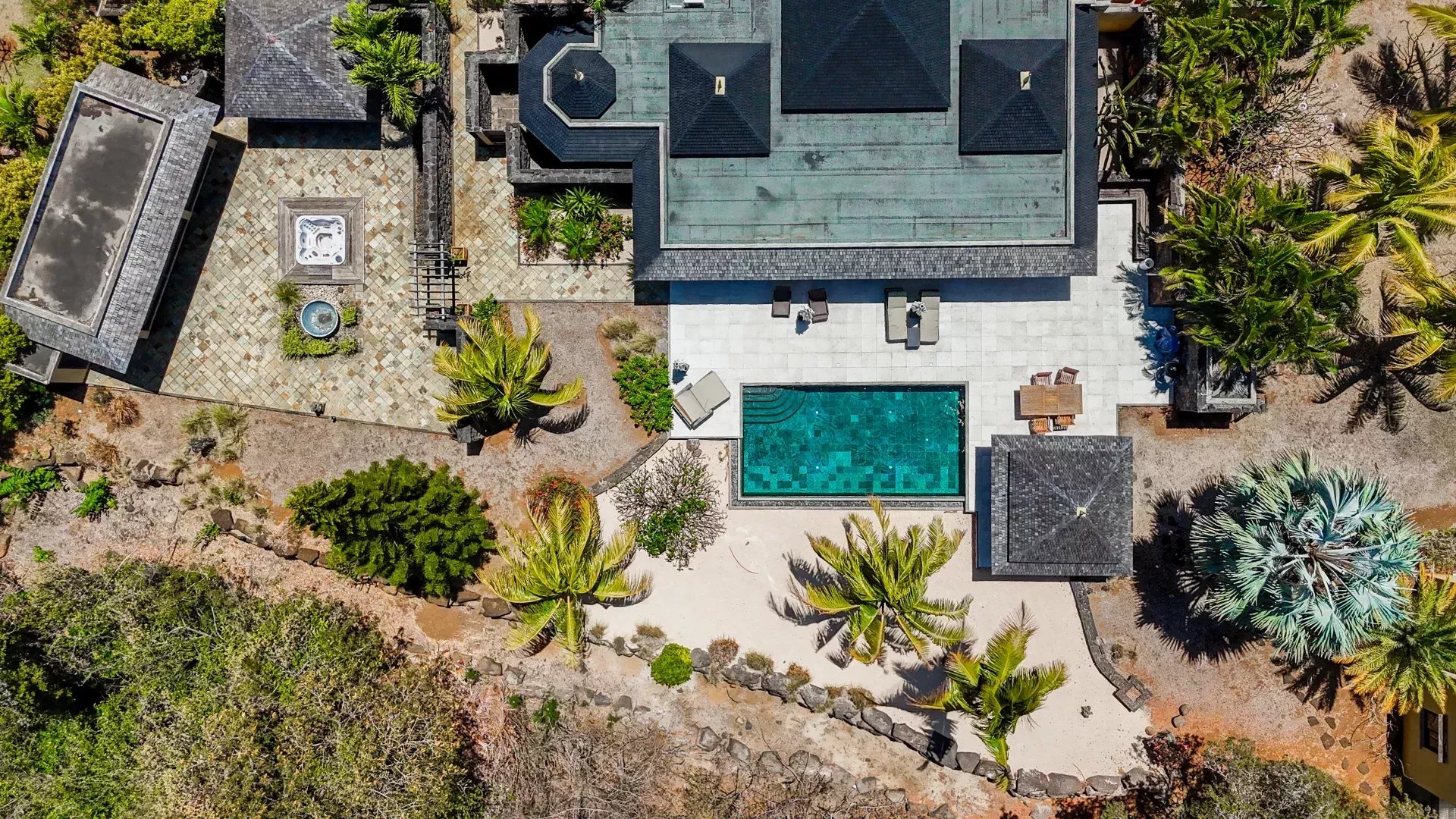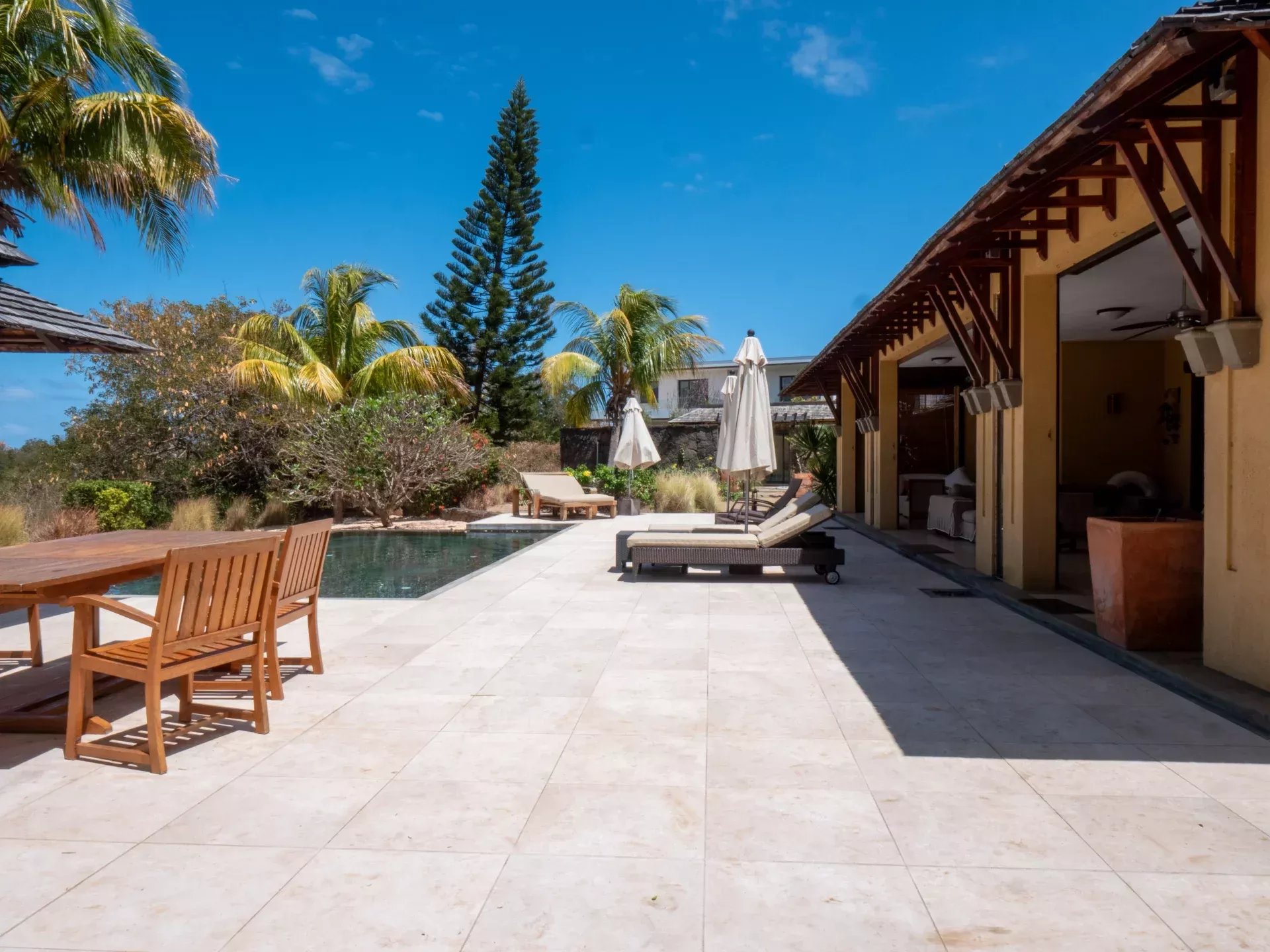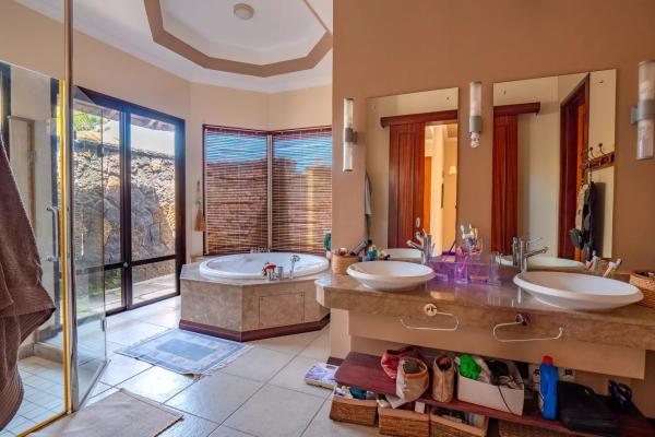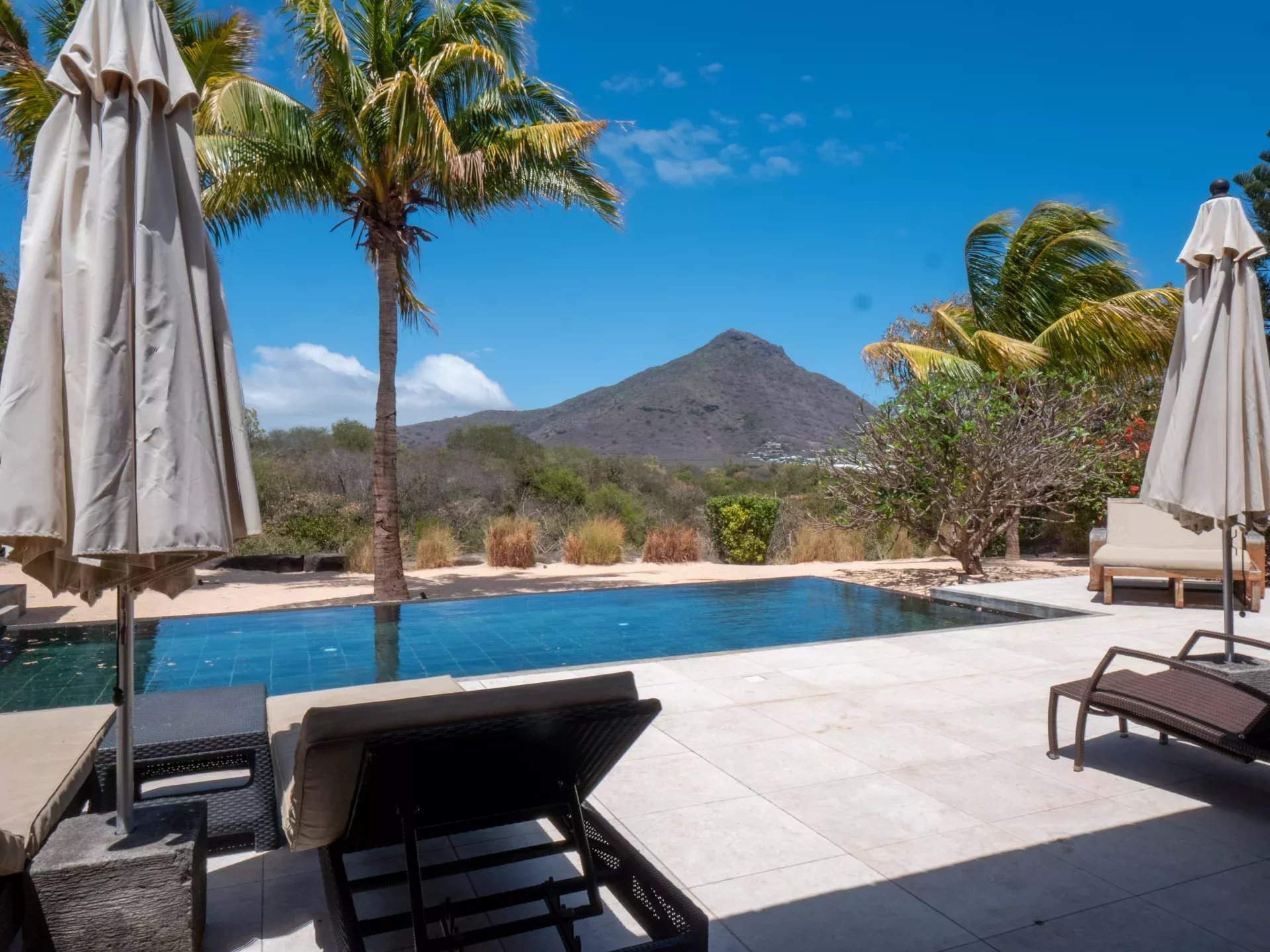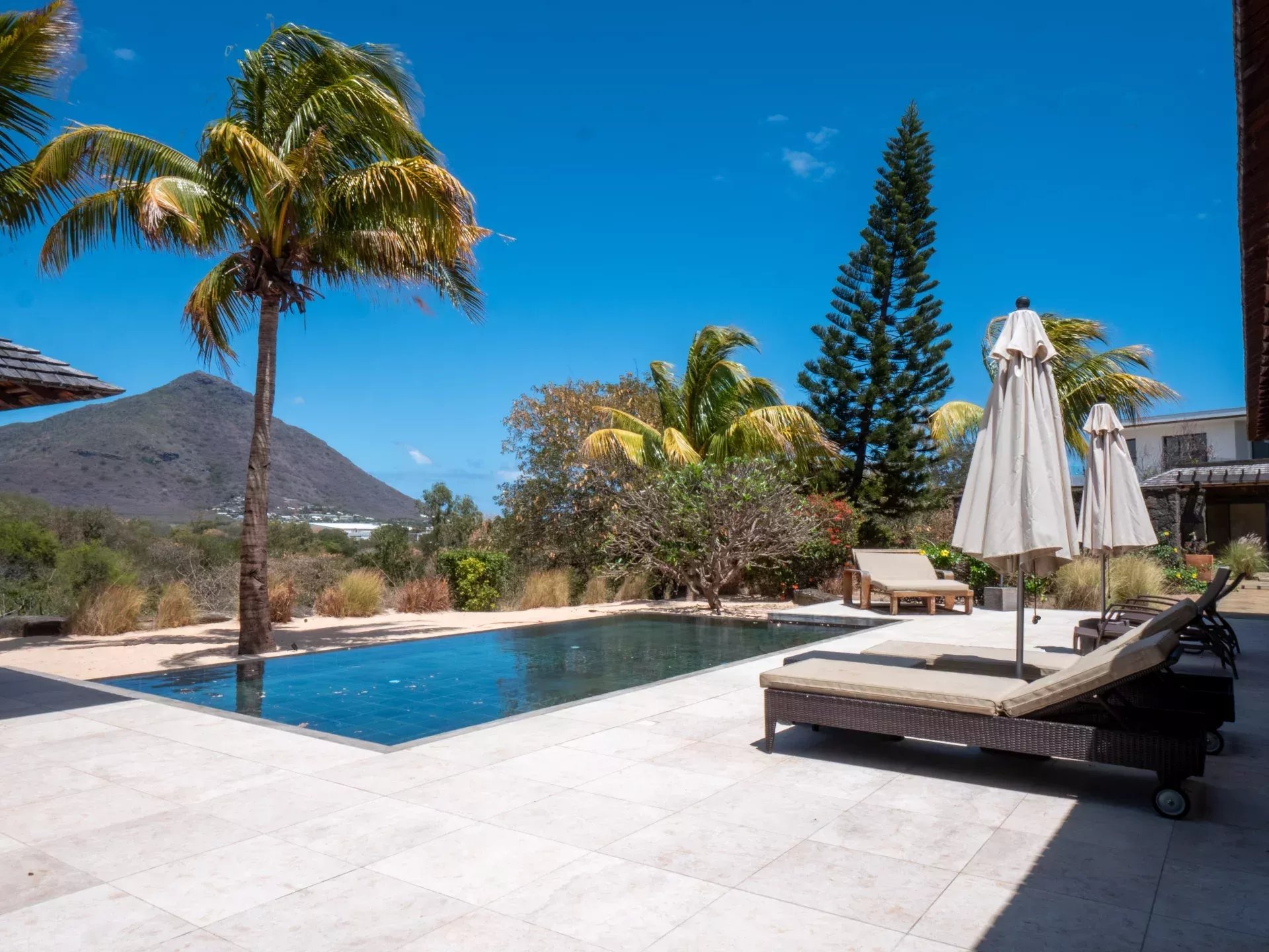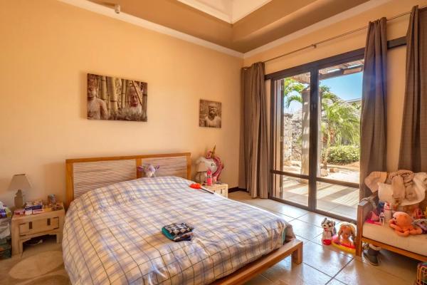 Les six chambres, toutes équipées de climatisation intégrée et de moustiquaires, offrent un niveau de confort élevé en toute saison. Chaque suite a été conçue pour préserver l’intimité de ses occupants, avec des salles de bains attenantes et des finitions soignées qui prolongent l’élégance générale de la villa. Les prestations techniques viennent compléter l’ensemble avec cohérence, notamment grâce à la présence d’un groupe électrogène, d’un portail électrique, d’un système de vidéo surveillance, de la fibre optique, d’un accès internet haut débit, d’un gardien et d’un service de sécurité discret. Cette villa réunit ainsi tous les éléments attendus d’une propriété de très haut standing dans l’un des secteurs les plus convoités de Tamarin.