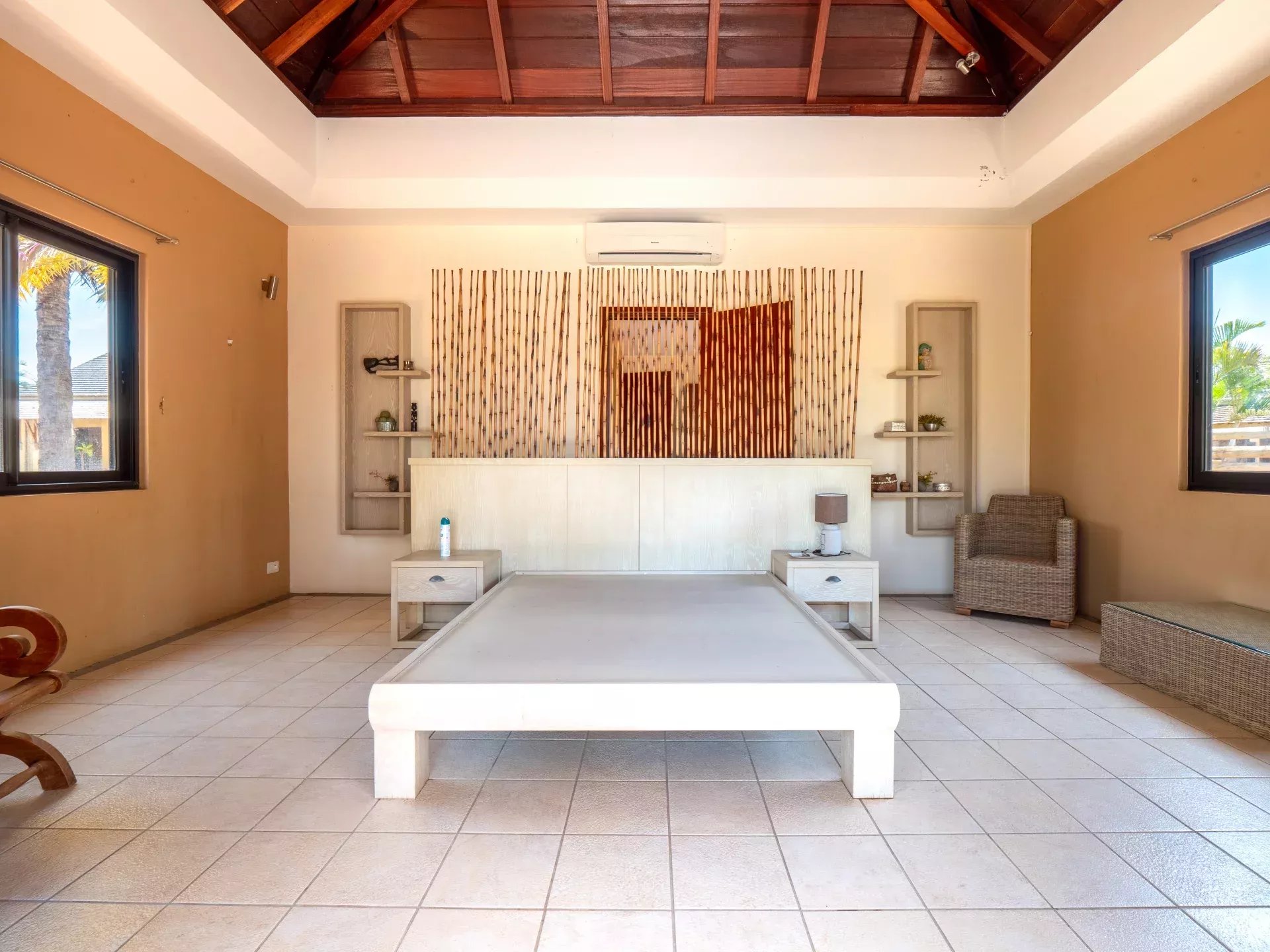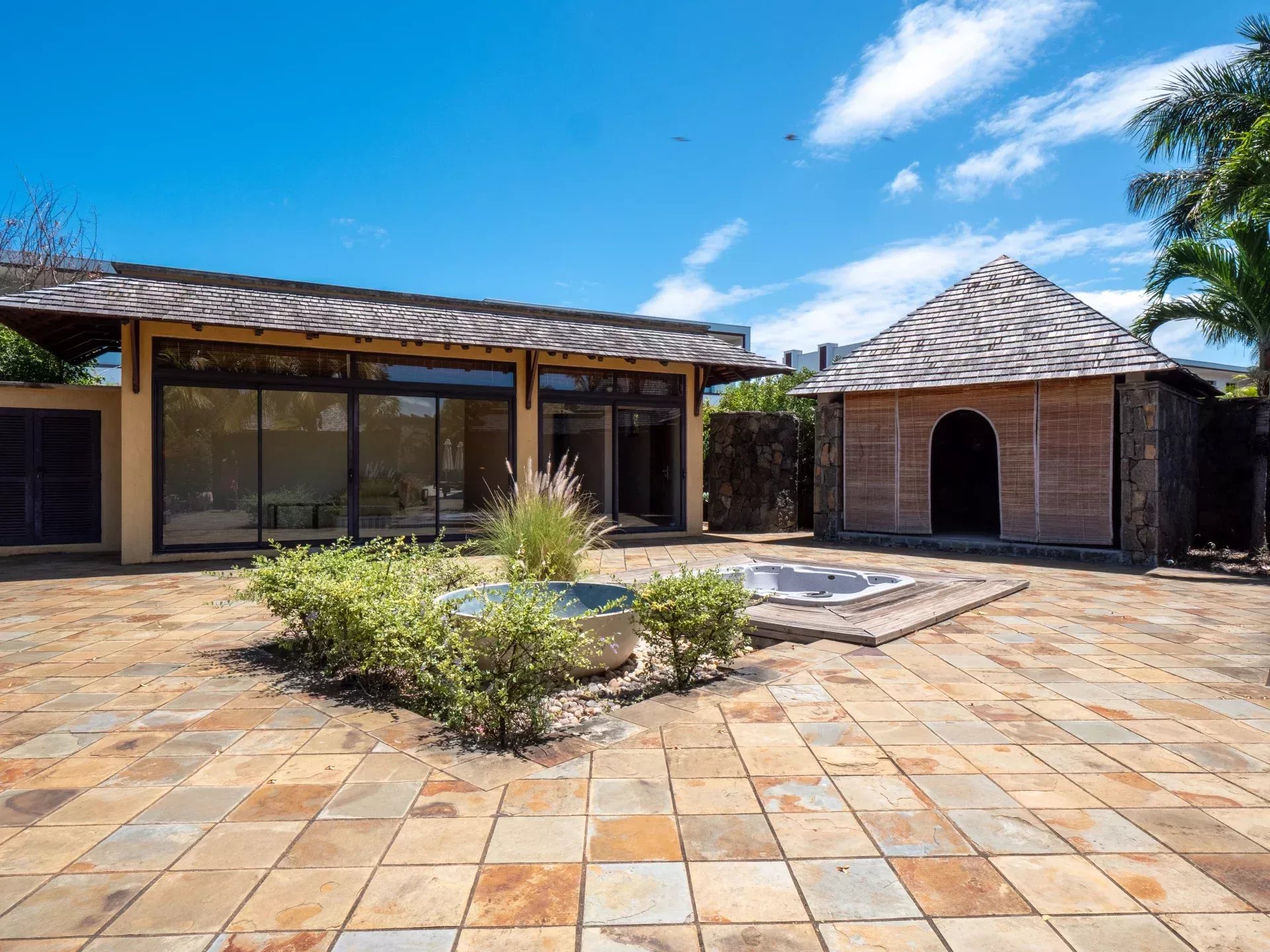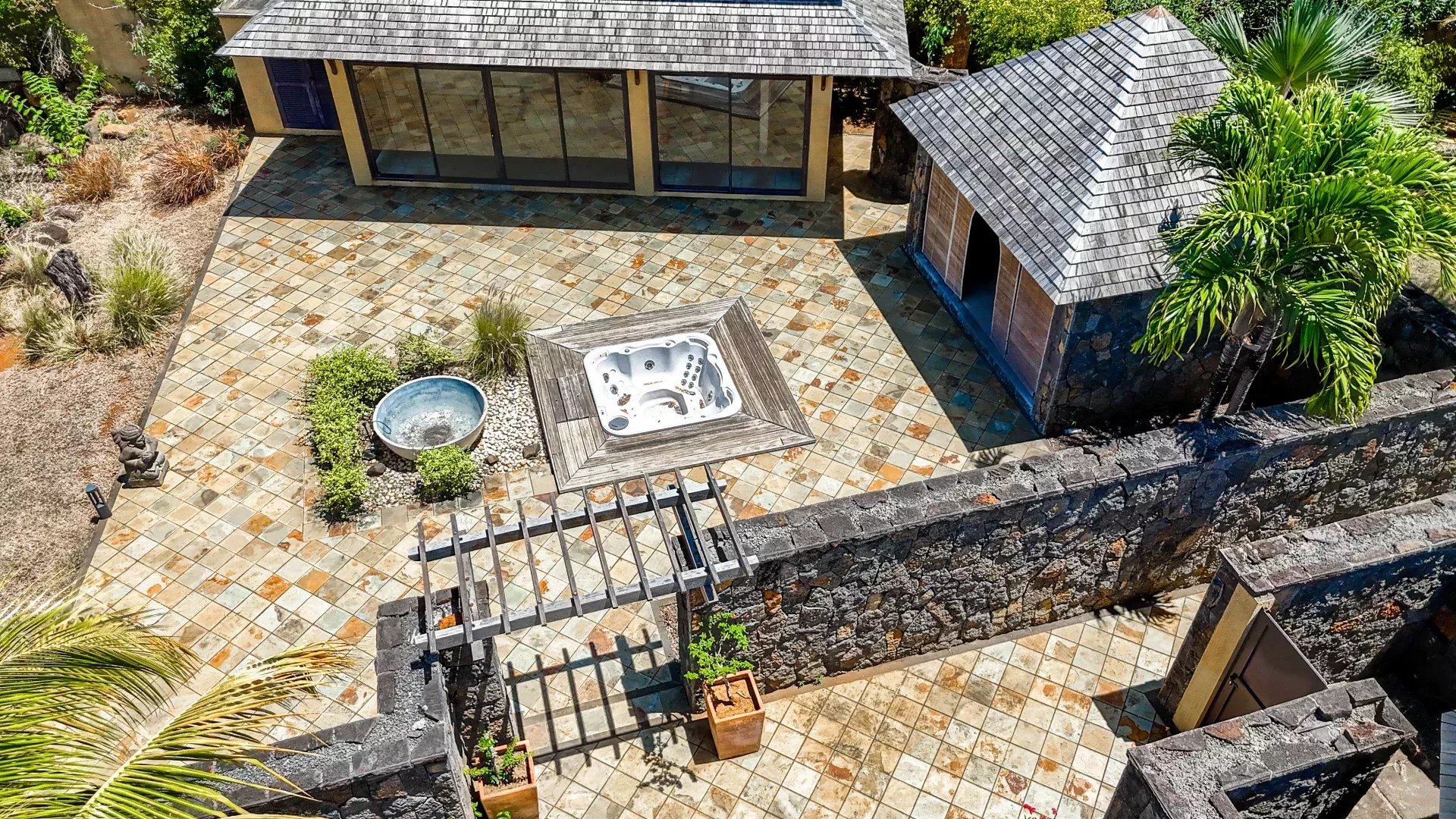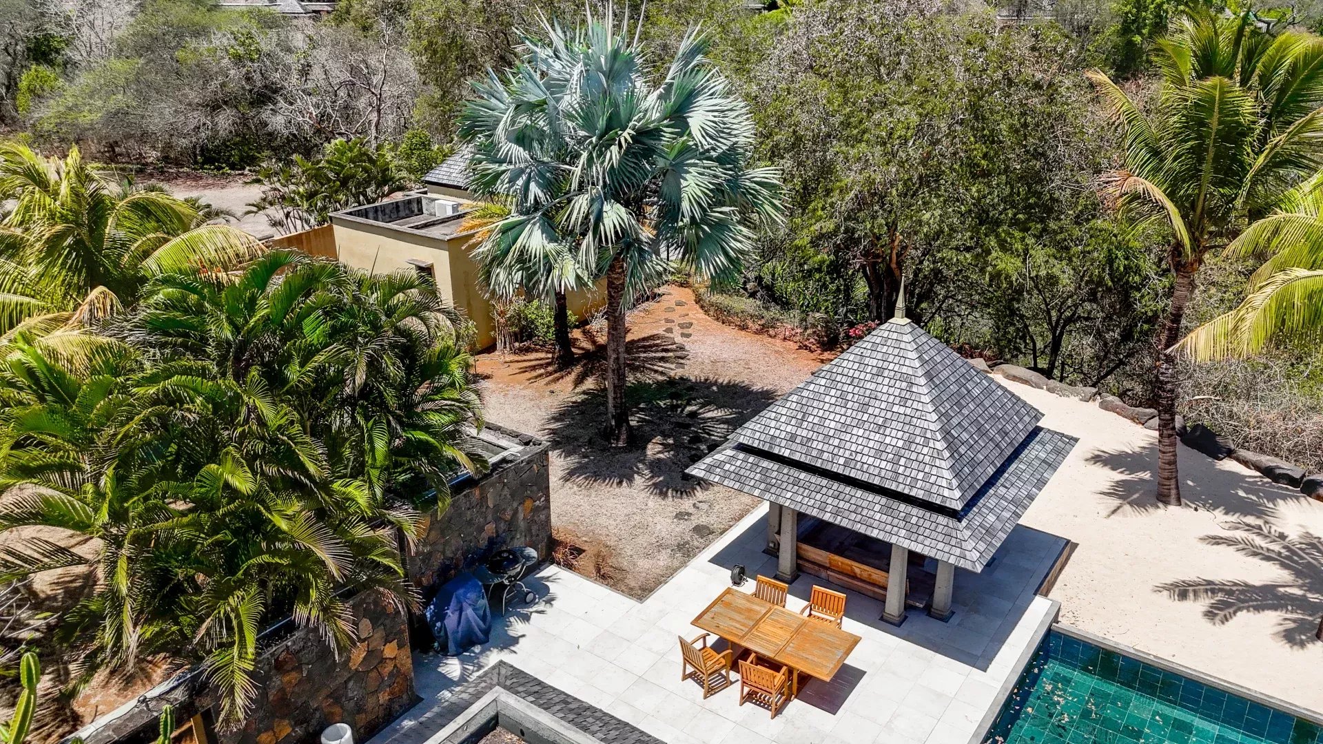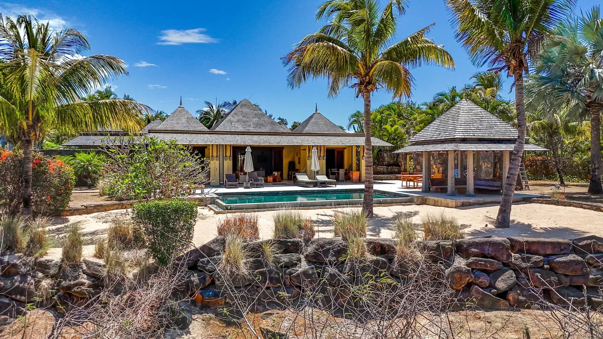 Les six chambres, toutes équipées de climatisation intégrée et de moustiquaires, offrent un niveau de confort élevé en toute saison. Chaque suite a été conçue pour préserver l’intimité de ses occupants, avec des salles de bains attenantes et des finitions soignées qui prolongent l’élégance générale de la villa. Les prestations techniques viennent compléter l’ensemble avec cohérence, notamment grâce à la présence d’un groupe électrogène, d’un portail électrique, d’un système de vidéo surveillance, de la fibre optique, d’un accès internet haut débit, d’un gardien et d’un service de sécurité discret. Cette villa réunit ainsi tous les éléments attendus d’une propriété de très haut standing dans l’un des secteurs les plus convoités de Tamarin.