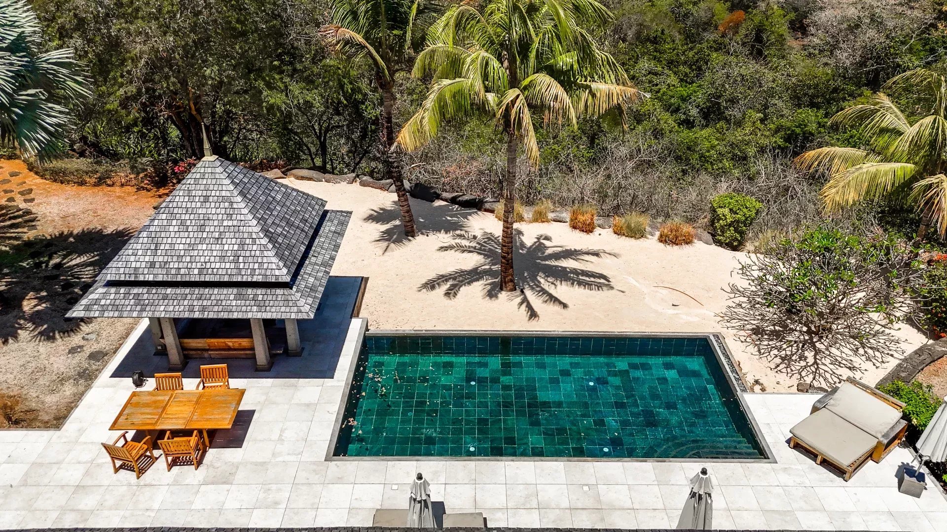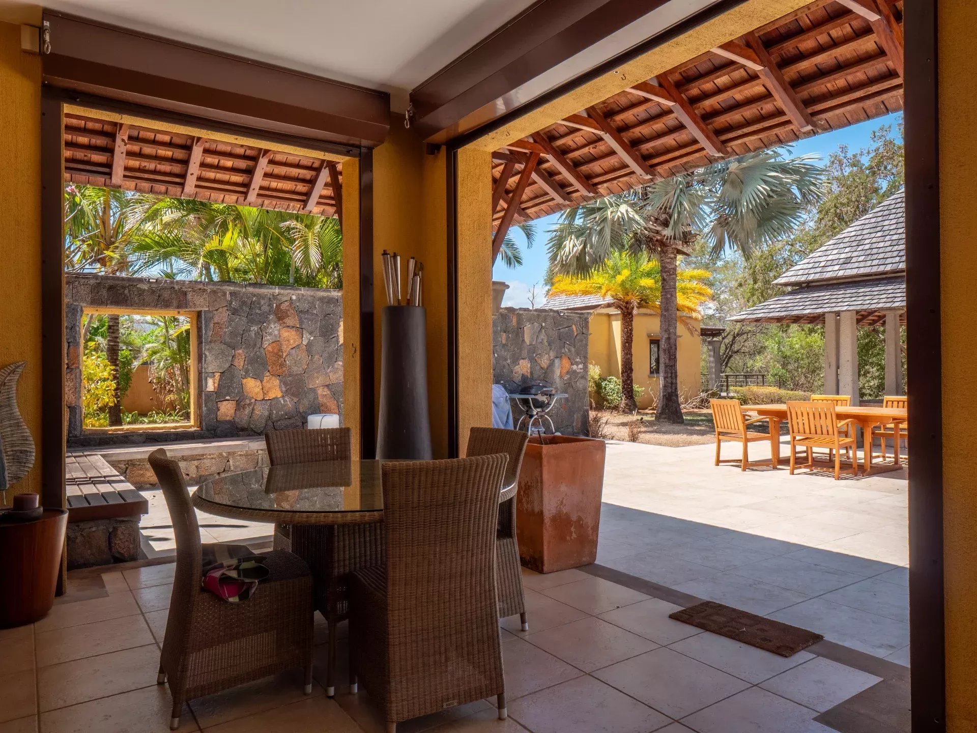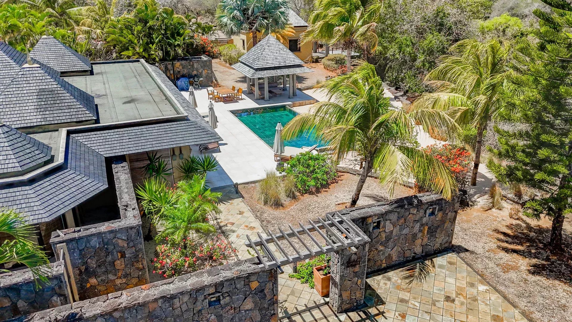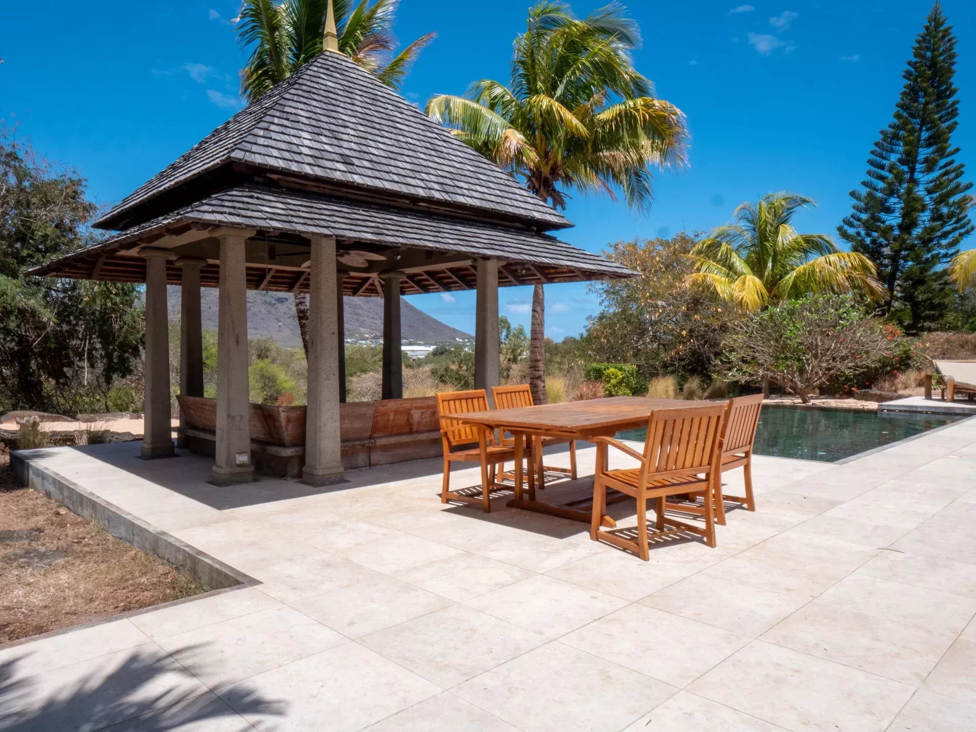 Les espaces de réception ont été pensés pour favoriser la convivialité sans jamais compromettre le confort. Le salon, spacieux et lumineux, s’ouvre sur une terrasse ombragée idéale pour recevoir ou profiter de moments plus calmes face au jardin. La cuisine moderne entièrement équipée s’intègre harmonieusement à l’ensemble et répond aux exigences d’un usage quotidien aussi bien qu’à celles d’une résidence de prestige. À l’extérieur, la piscine privée chauffée s’inscrit dans un jardin paysager soigneusement entretenu, où les essences locales créent un véritable écrin de verdure. Les différentes terrasses permettent de profiter de plusieurs ambiances au fil de la journée, entre détente, repas en plein air et contemplation du paysage.