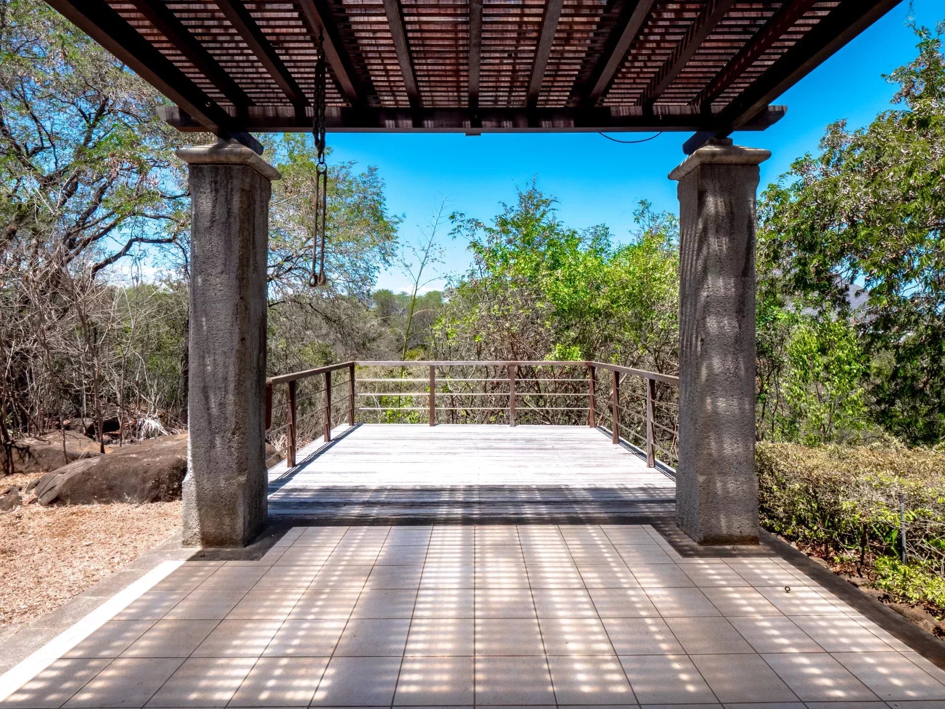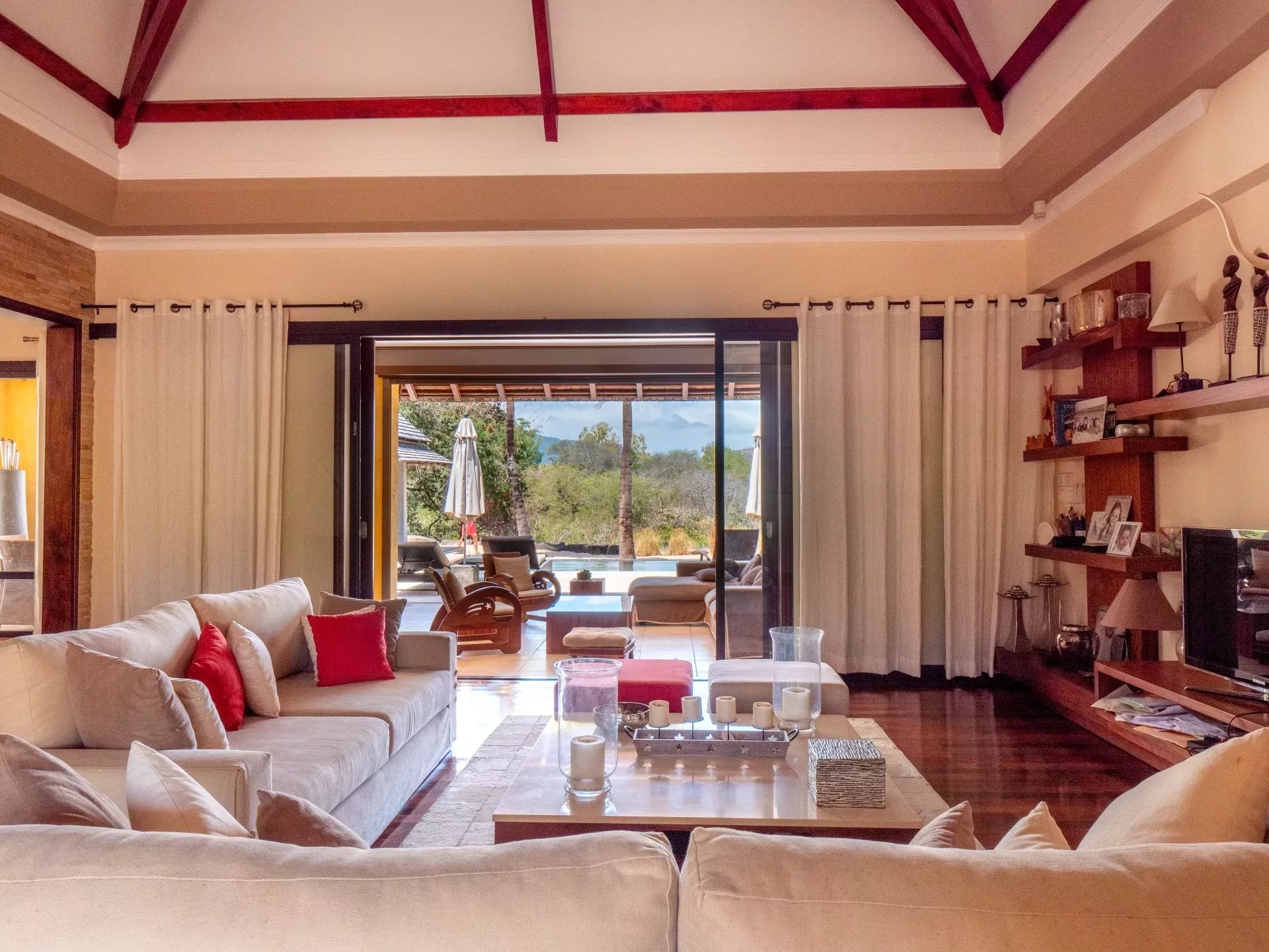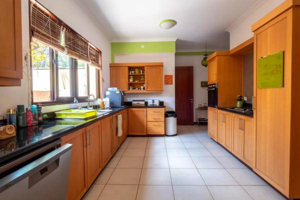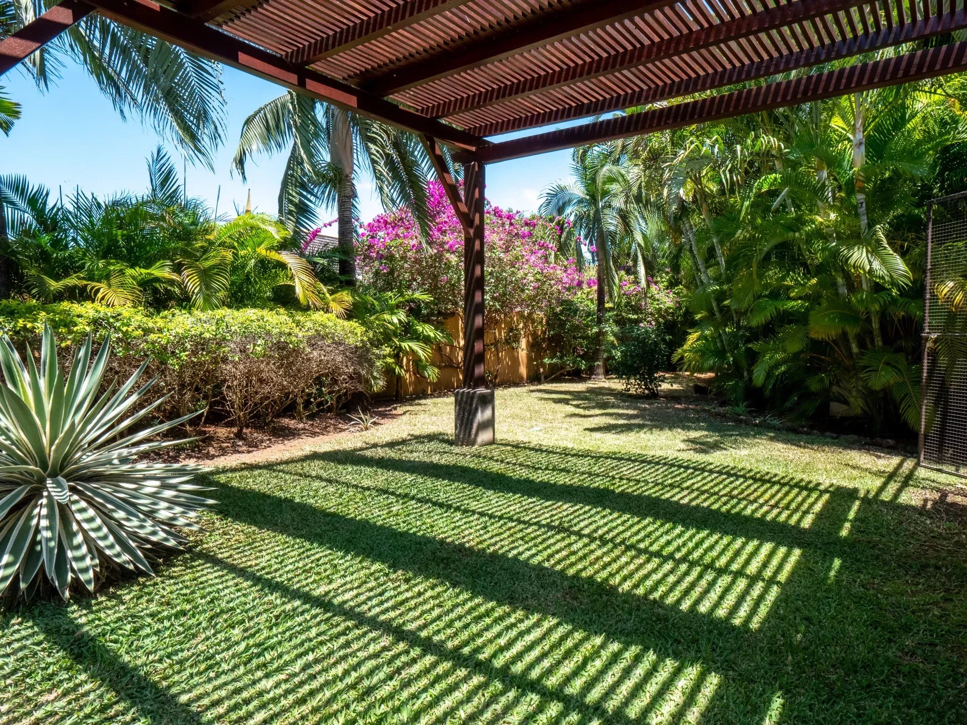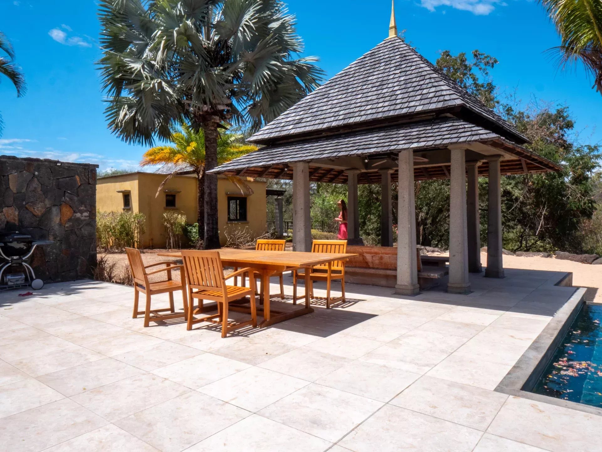 Les espaces de réception ont été pensés pour favoriser la convivialité sans jamais compromettre le confort. Le salon, spacieux et lumineux, s’ouvre sur une terrasse ombragée idéale pour recevoir ou profiter de moments plus calmes face au jardin. La cuisine moderne entièrement équipée s’intègre harmonieusement à l’ensemble et répond aux exigences d’un usage quotidien aussi bien qu’à celles d’une résidence de prestige. À l’extérieur, la piscine privée chauffée s’inscrit dans un jardin paysager soigneusement entretenu, où les essences locales créent un véritable écrin de verdure. Les différentes terrasses permettent de profiter de plusieurs ambiances au fil de la journée, entre détente, repas en plein air et contemplation du paysage.