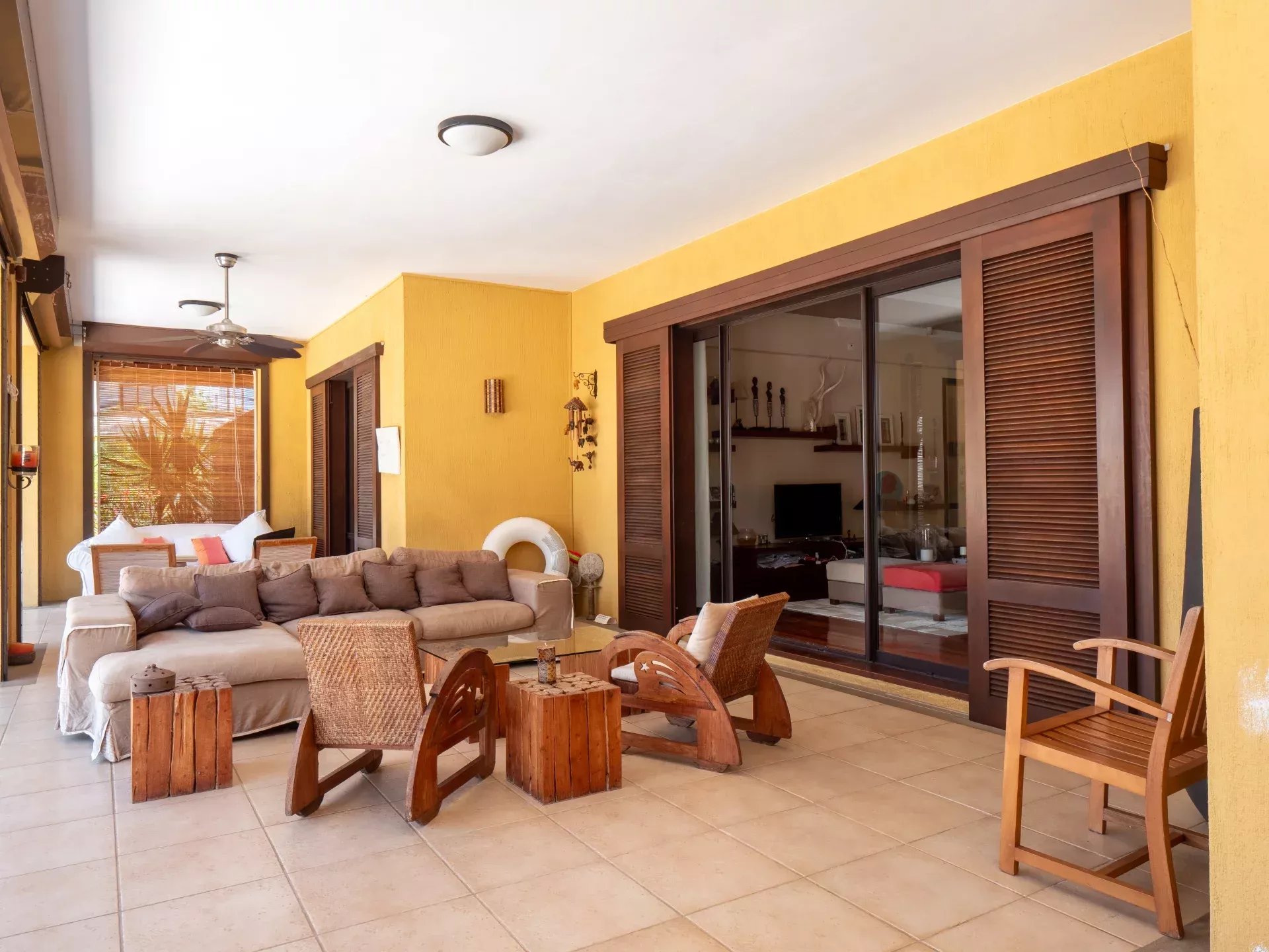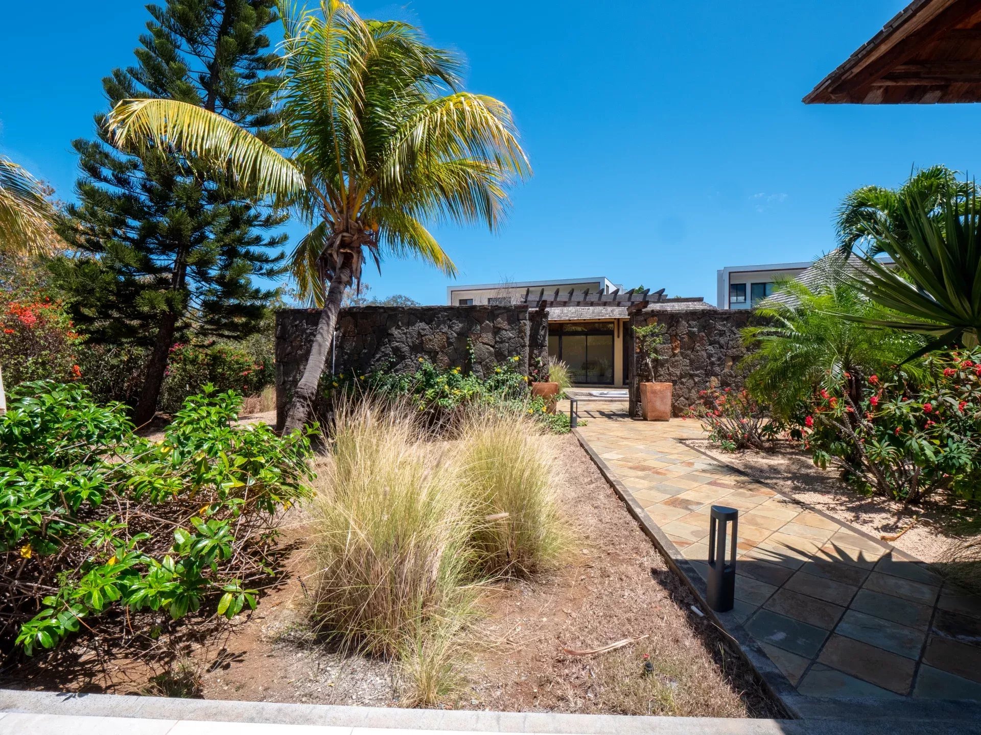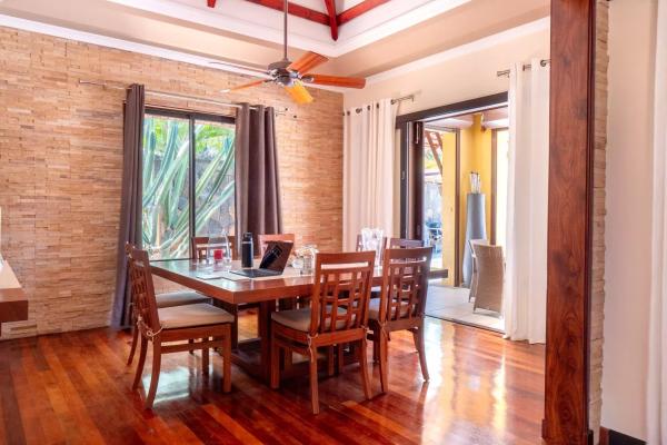 Son architecture contemporaine met en valeur des lignes épurées, une belle ouverture sur l’extérieur et une sélection de matériaux nobles qui renforcent son caractère raffiné. Les vastes baies vitrées coulissantes en aluminium prolongent naturellement les espaces de vie vers les terrasses et offrent un panorama dégagé sur le parcours de golf et les espaces verts environnants. La lumière naturelle accompagne chaque volume tout au long de la journée, tandis que le double vitrage assure un confort acoustique particulièrement appréciable. L’ensemble dégage une sensation de sérénité, de fluidité et d’équilibre parfaitement adaptée à un mode de vie tropical haut de gamme.