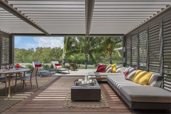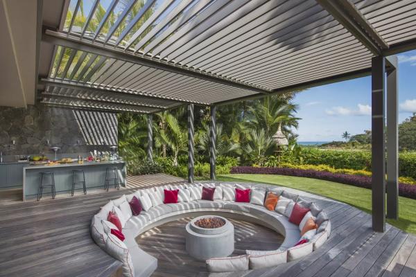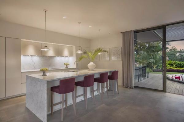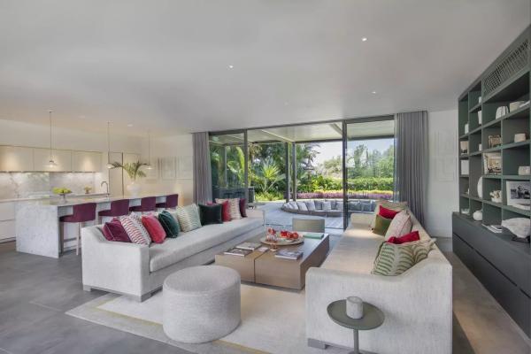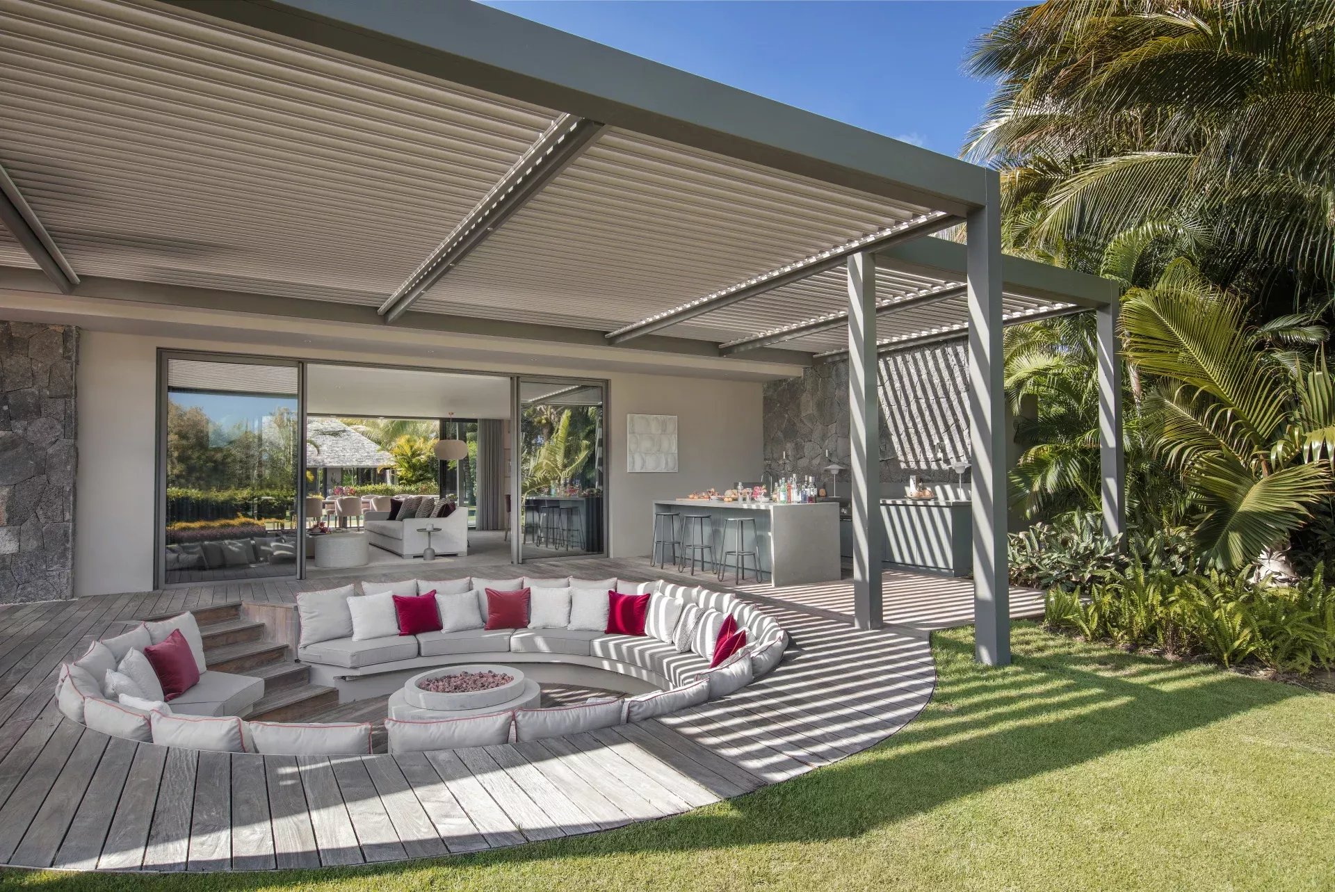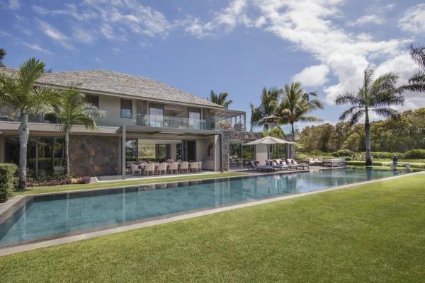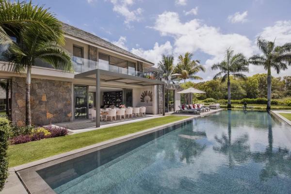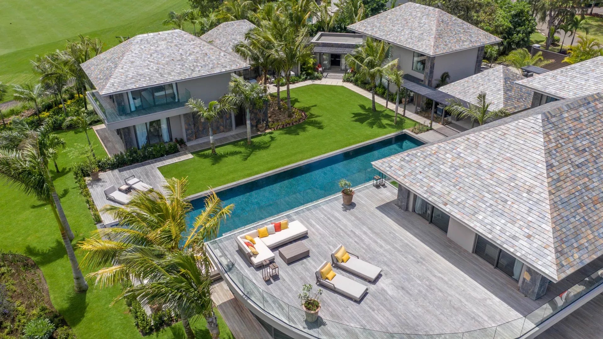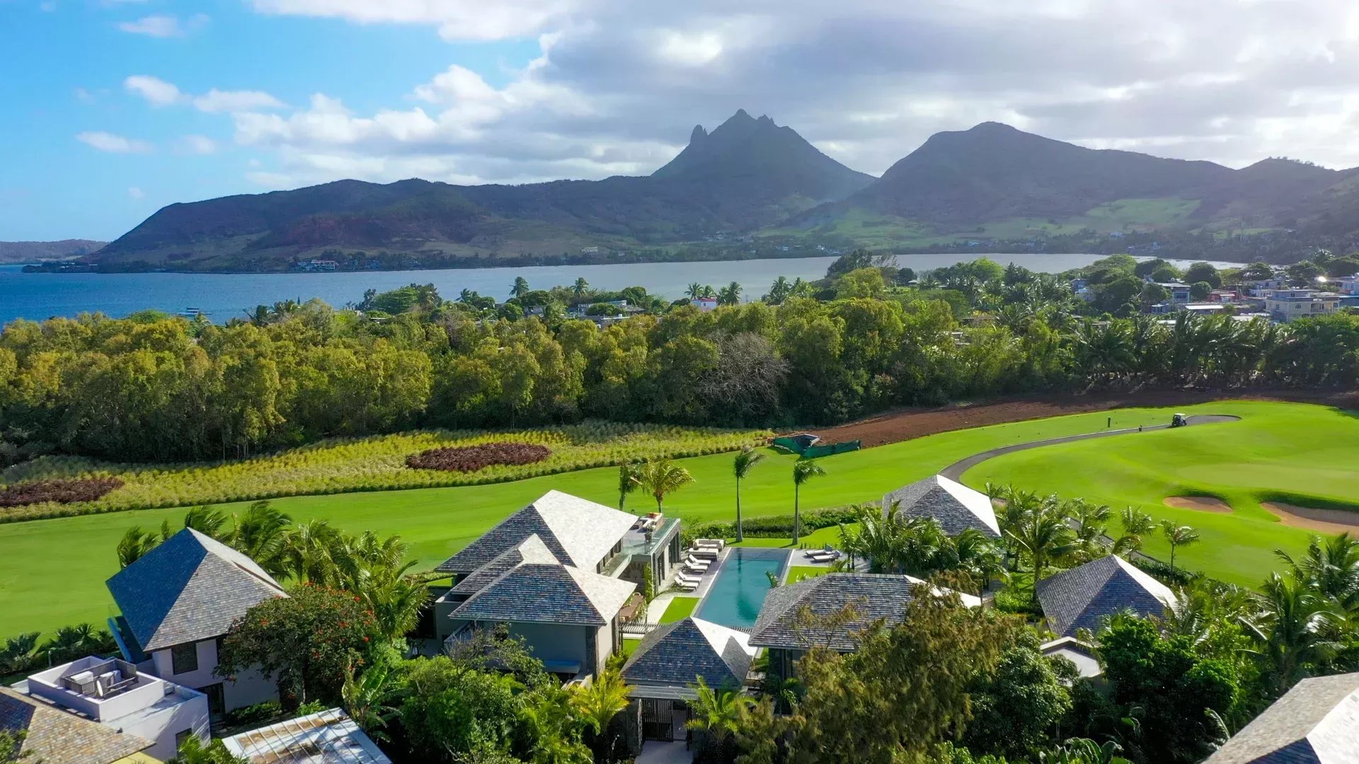 L’architecture se déploie avec élégance sur plus de 900 m², entièrement tournée vers l’horizon. Posée sur un terrain arboré de 2 775 m², elle offre un équilibre parfait entre espaces de réception ouverts et zones de calme absolu. La piscine à débordement, longue de 25 mètres, prolonge la ligne d’eau jusqu’au ciel, tandis que les vues panoramiques capturent l’essence même de la côte est mauricienne : lagon cristallin, fairways ondulants et silhouettes montagneuses.