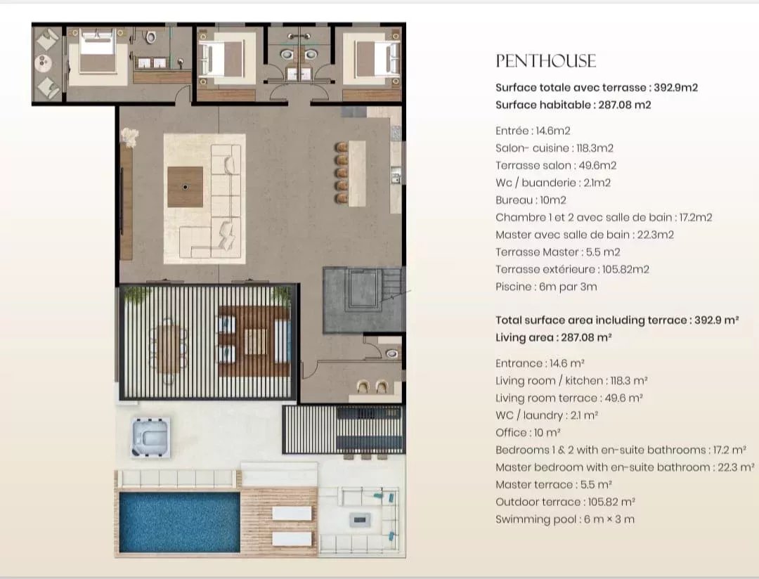 – Superficie totale : 393 m², avec 287 m² de surface habitable et un toit terrasse privé de 106 m².