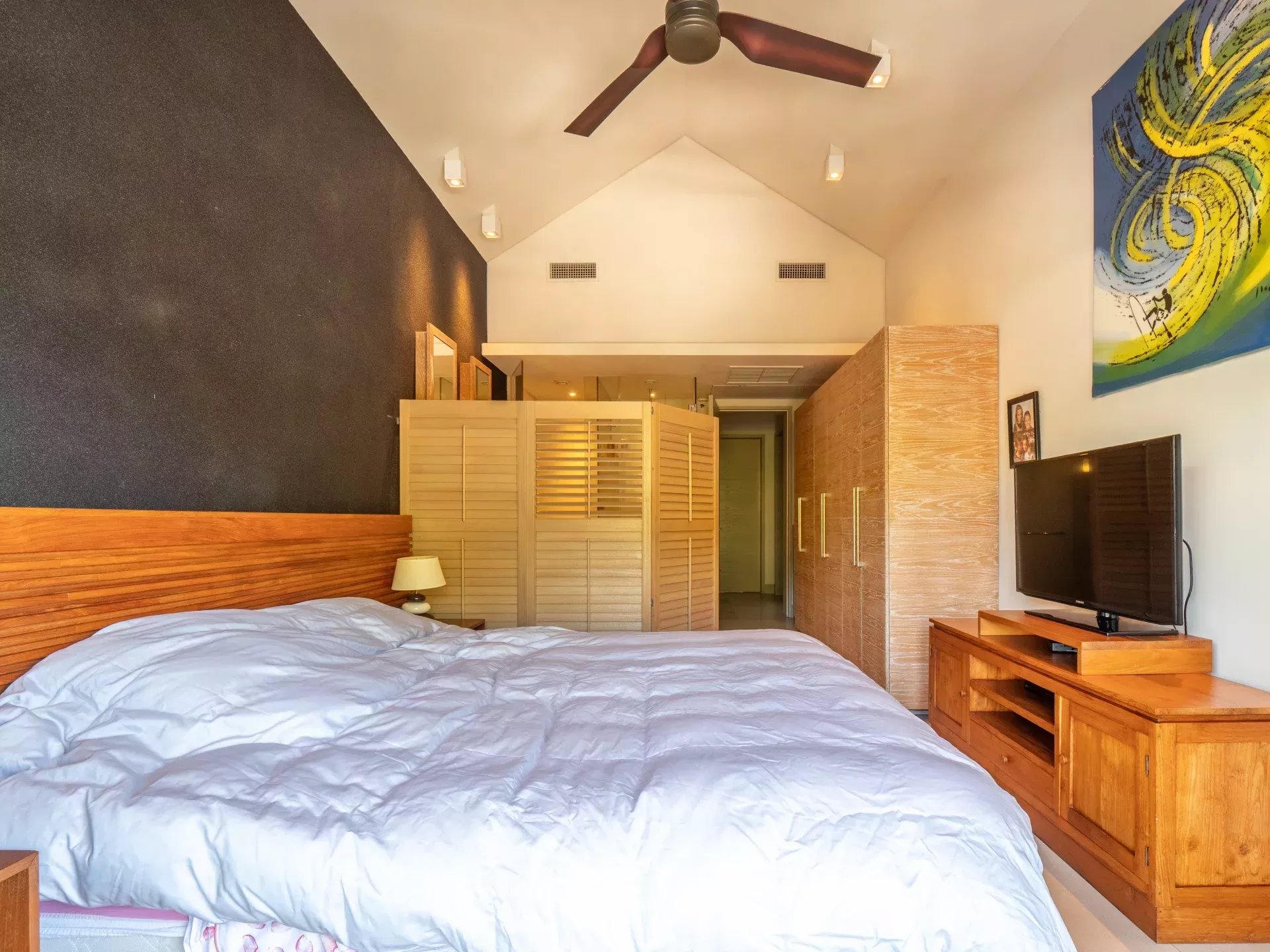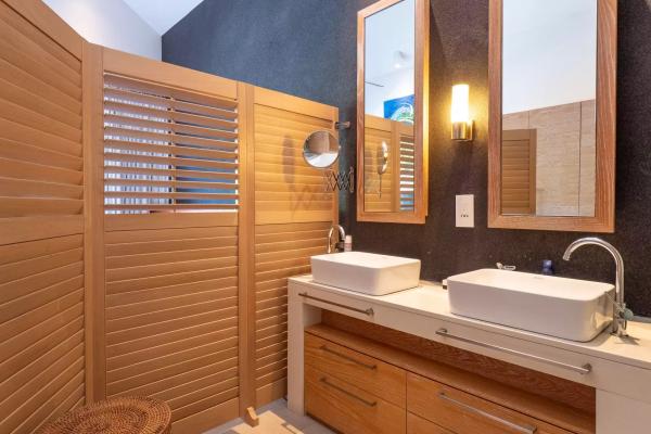 À l’étage, l’espace nuit a été pensé pour offrir un équilibre fonctionnel entre intimité et praticité. La chambre principale dispose de sa salle de bain en suite, tandis que deux autres chambres se partagent une seconde salle de bain. Cette configuration convient aussi bien à une famille qu’à une résidence secondaire destinée à recevoir, tout en répondant aux attentes du marché locatif haut de gamme dans ce secteur.