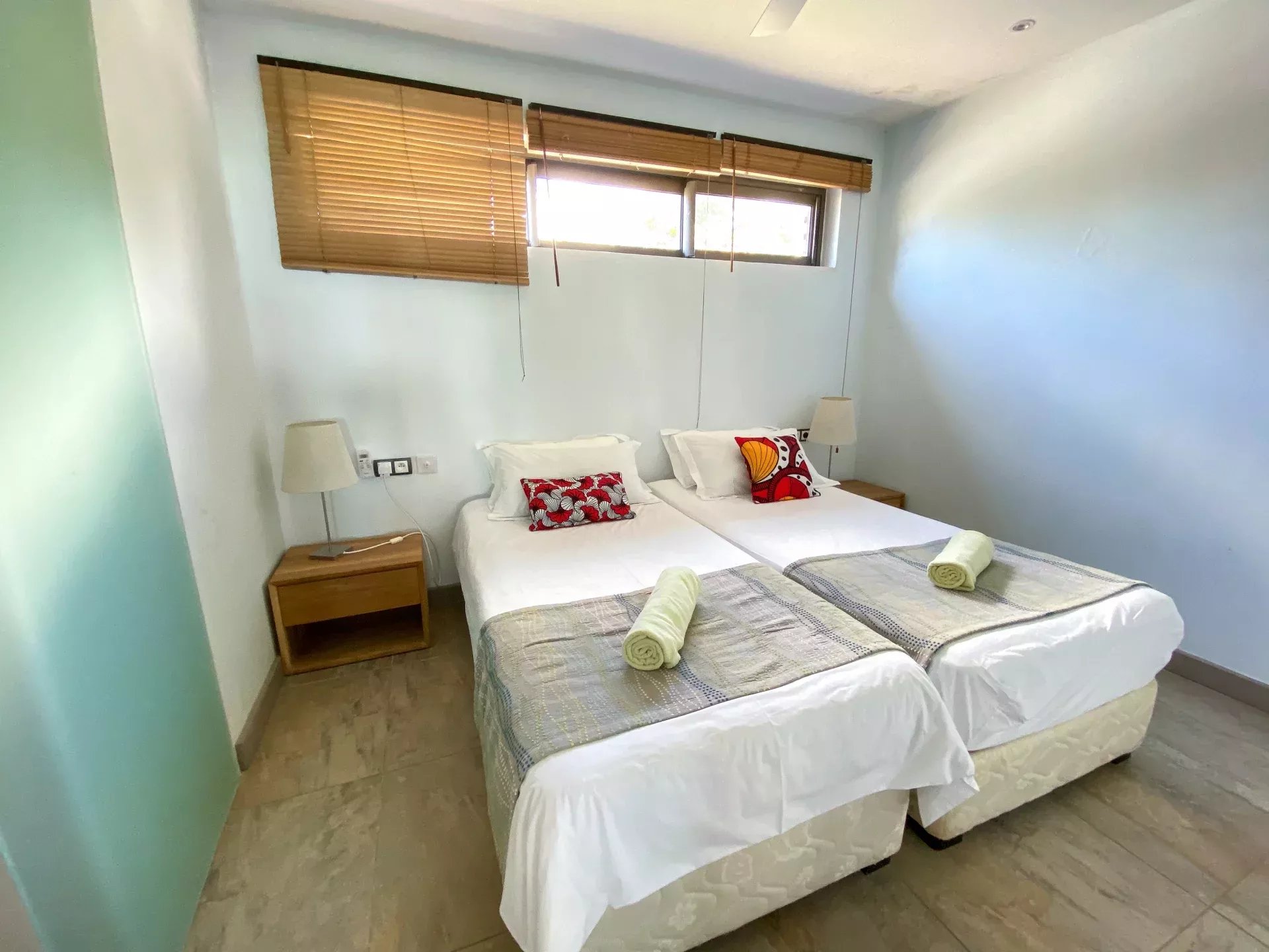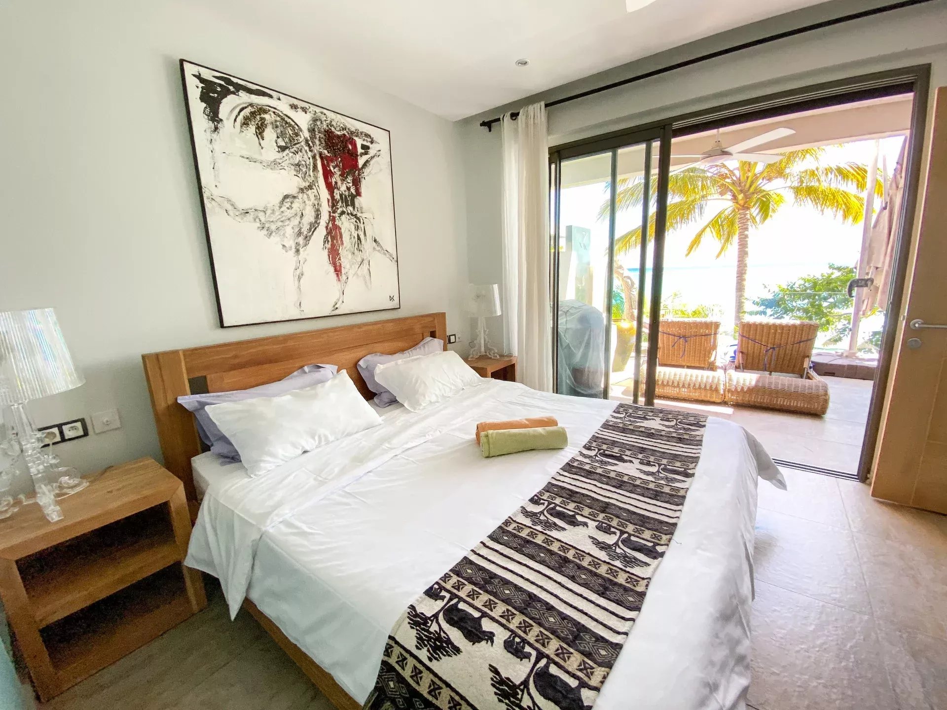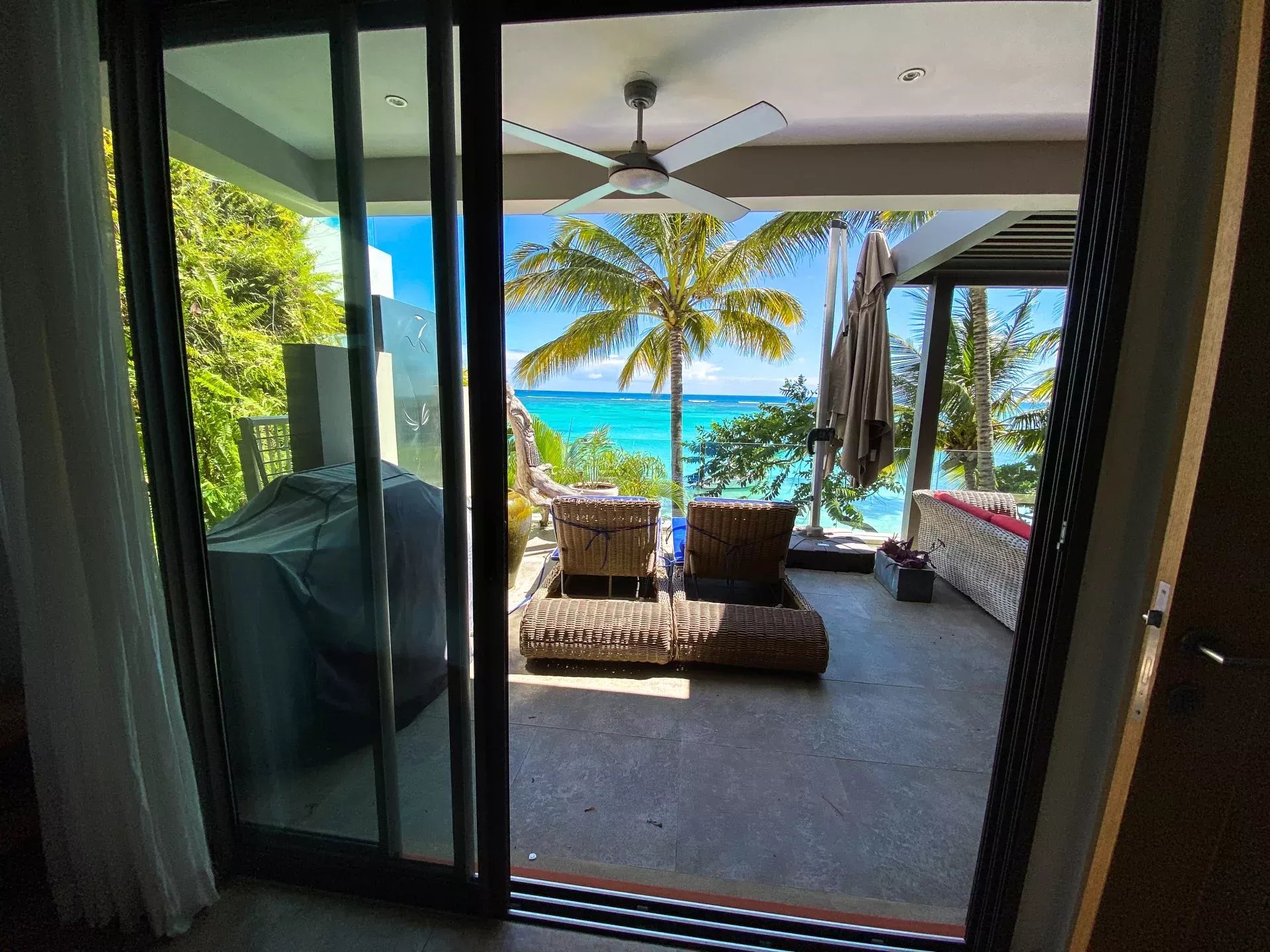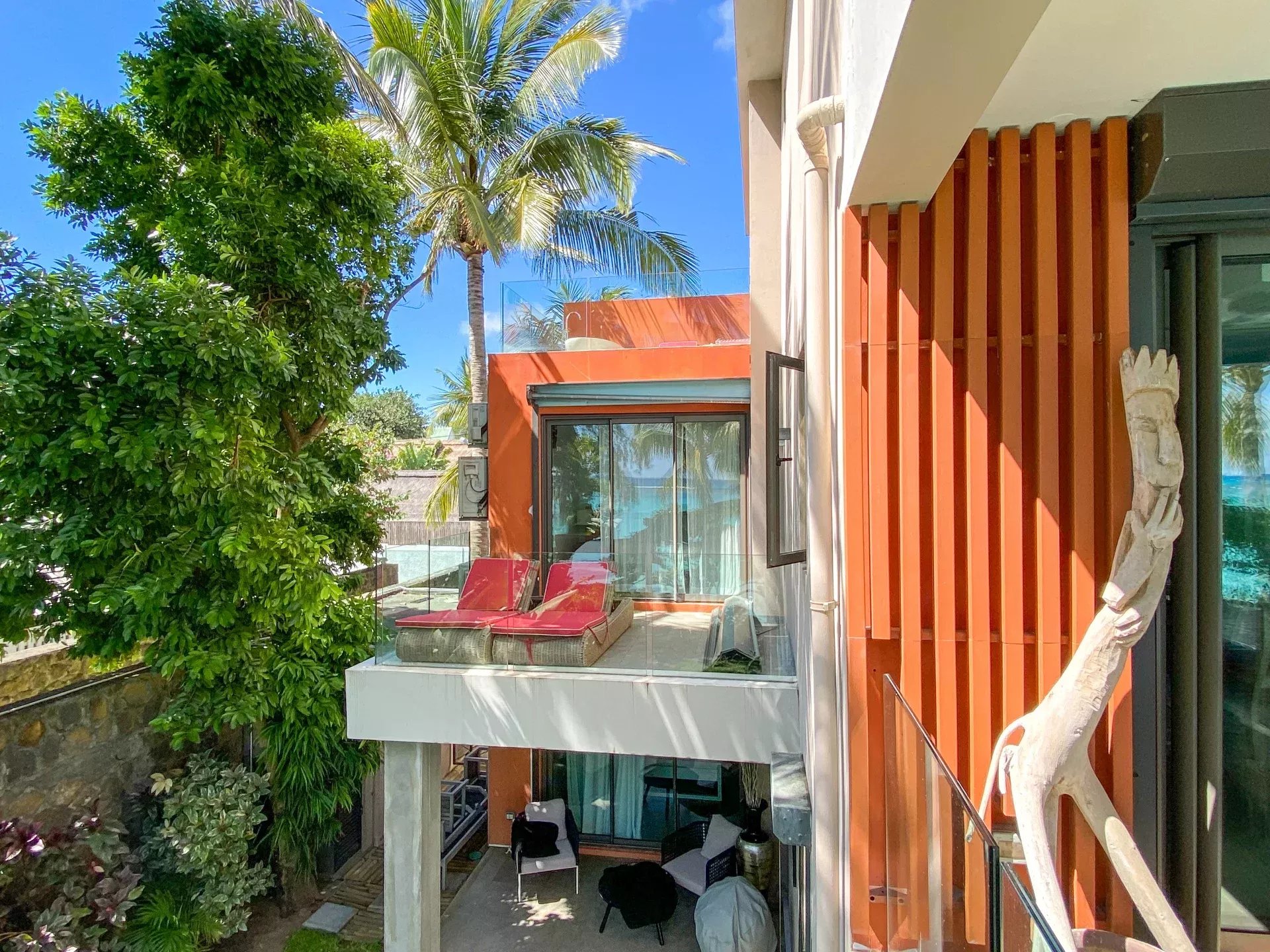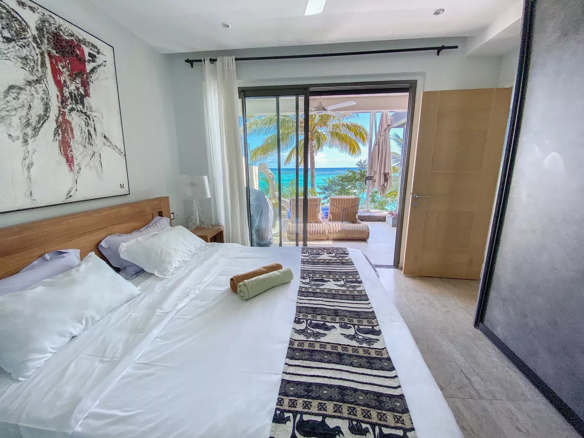 – 3 Chambres à coucher dont une en suite, 2 avec accès terrasse et vue sur le lagon.