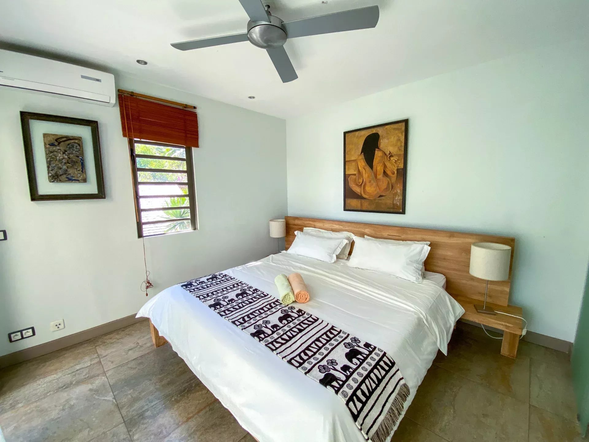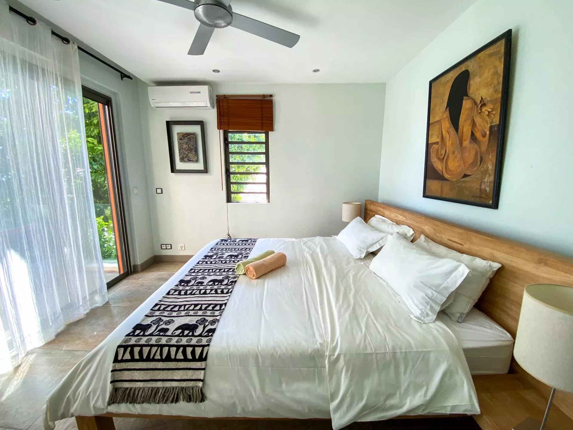 – Climatisation dans toutes les pièces + ventilateurs aux plafonds.