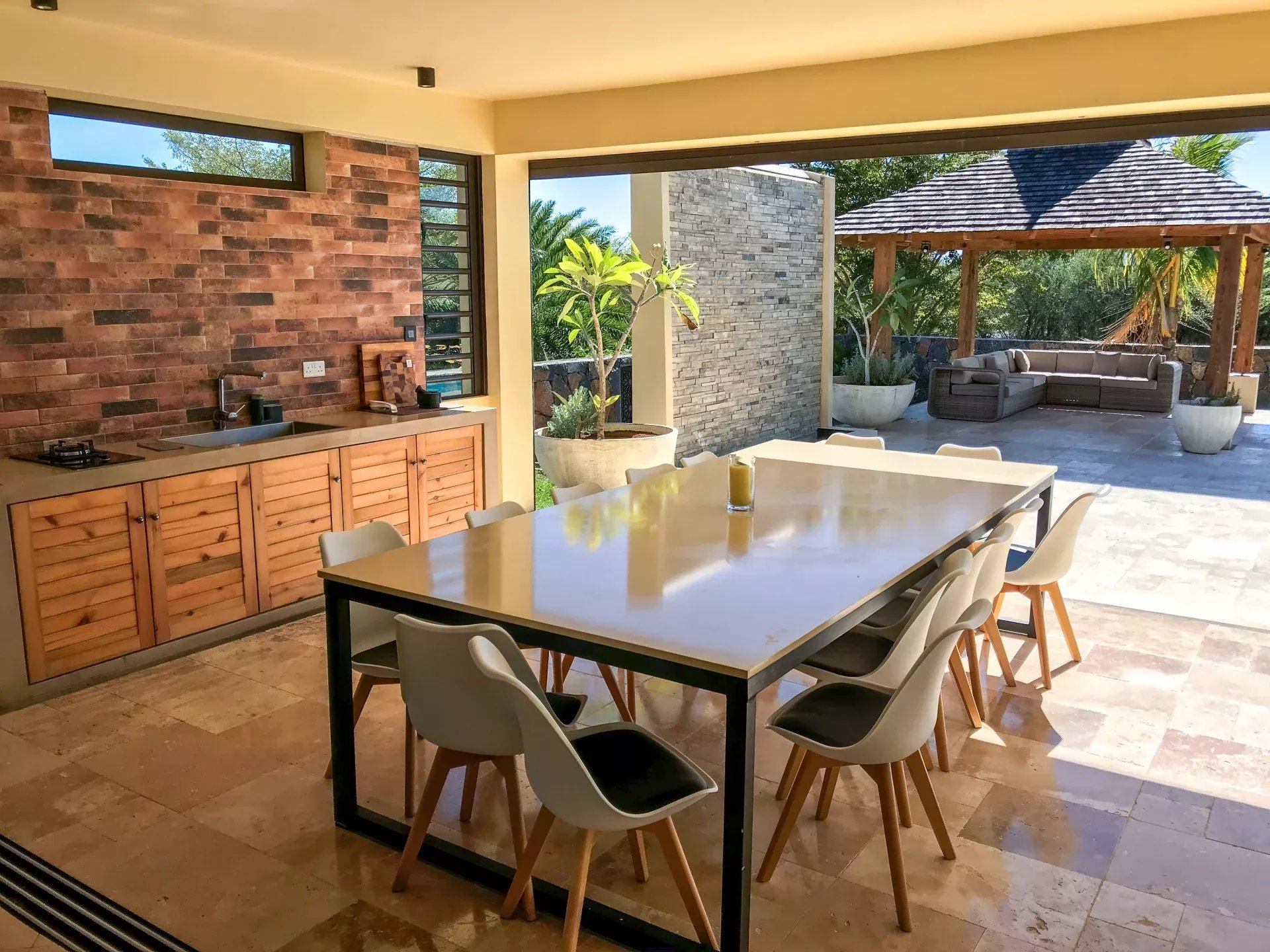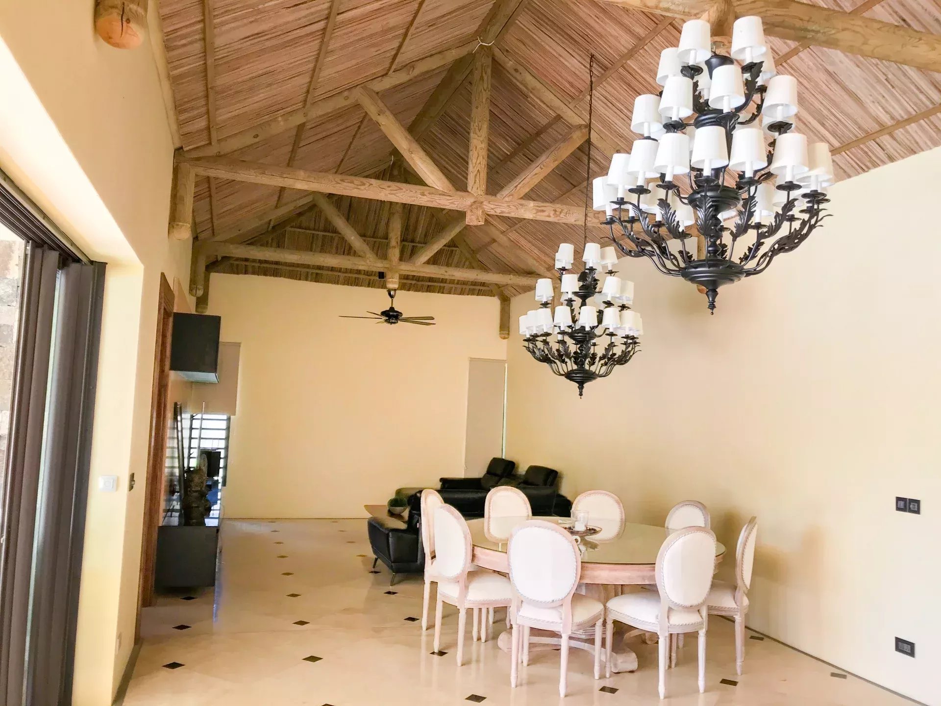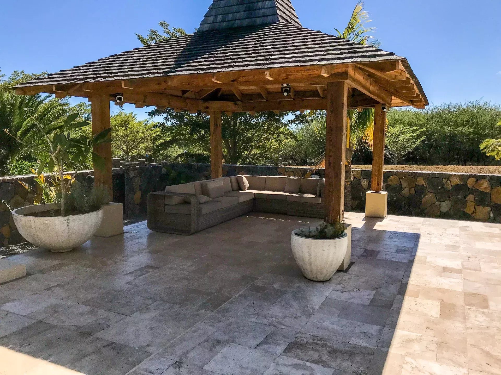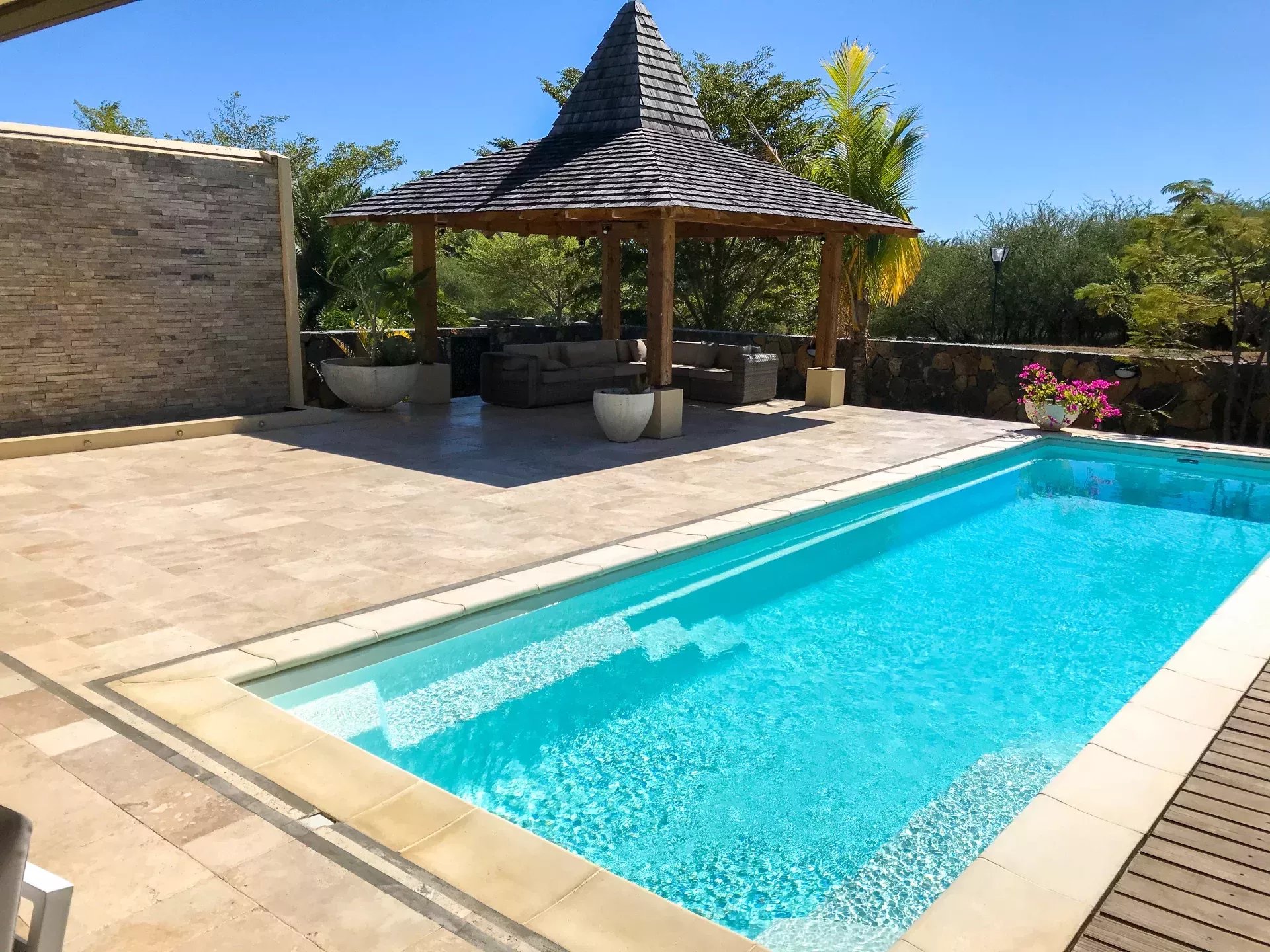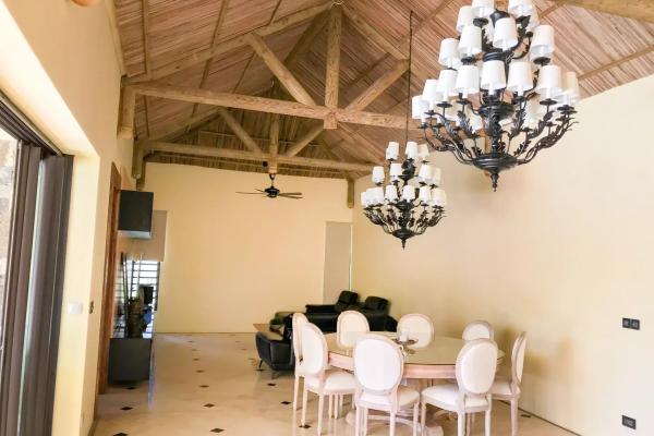 Elle offre de grand espaces de vie grâce a son salon, sa cuisine. Sa grande varangue ouverte sur une magnifique cuisine extérieure ,la piscine, un kiosk et le jardin.