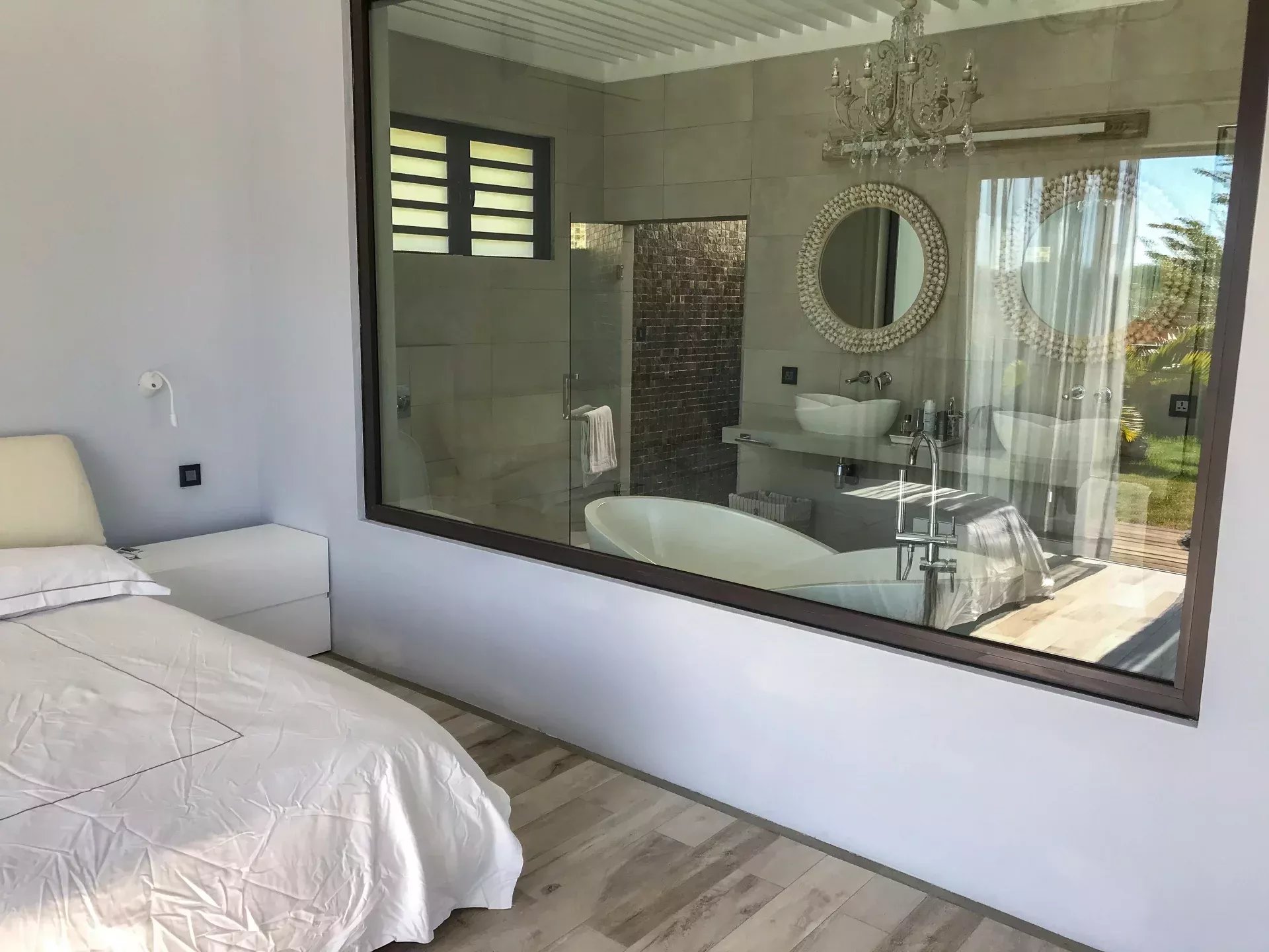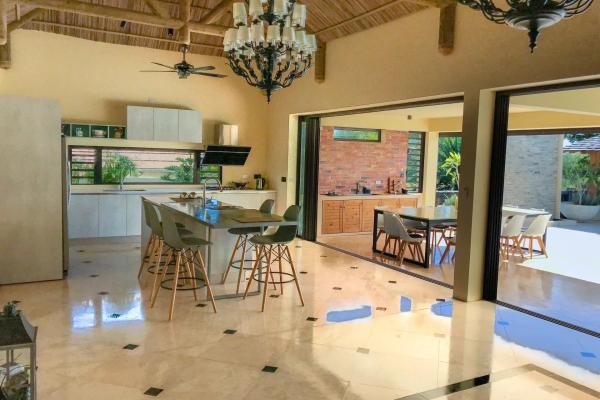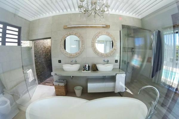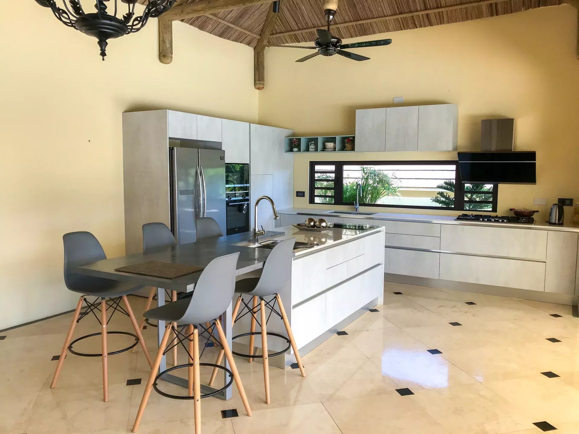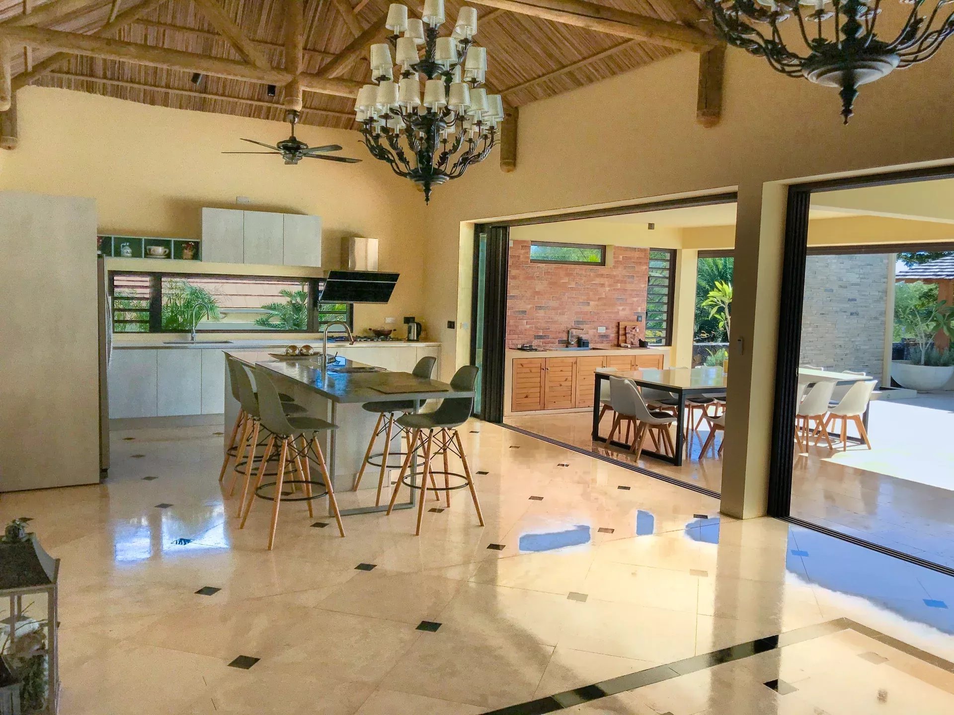 Elle offre de grand espaces de vie grâce a son salon, sa cuisine. Sa grande varangue ouverte sur une magnifique cuisine extérieure ,la piscine, un kiosk et le jardin.