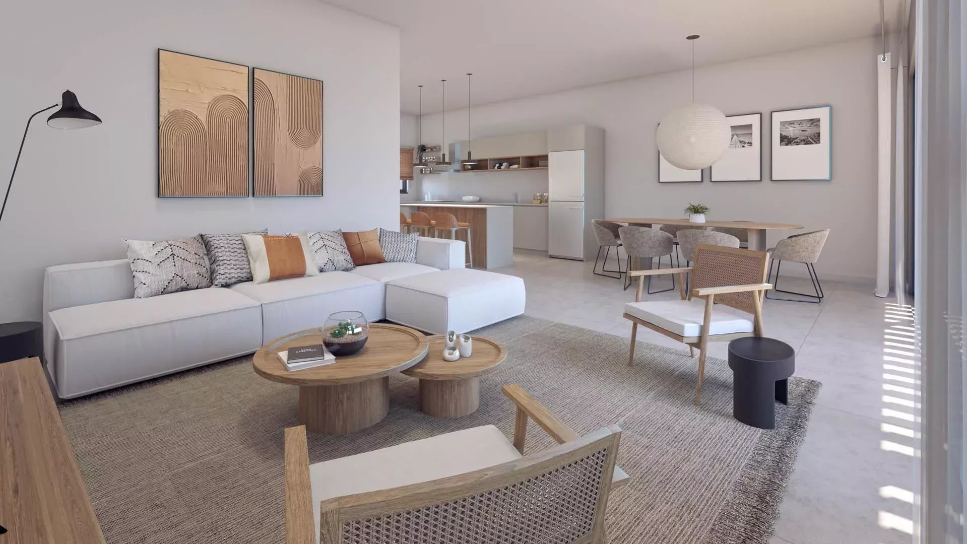 Espaces de vie baignant dans la lumière naturelle grâce aux larges baies vitrées.