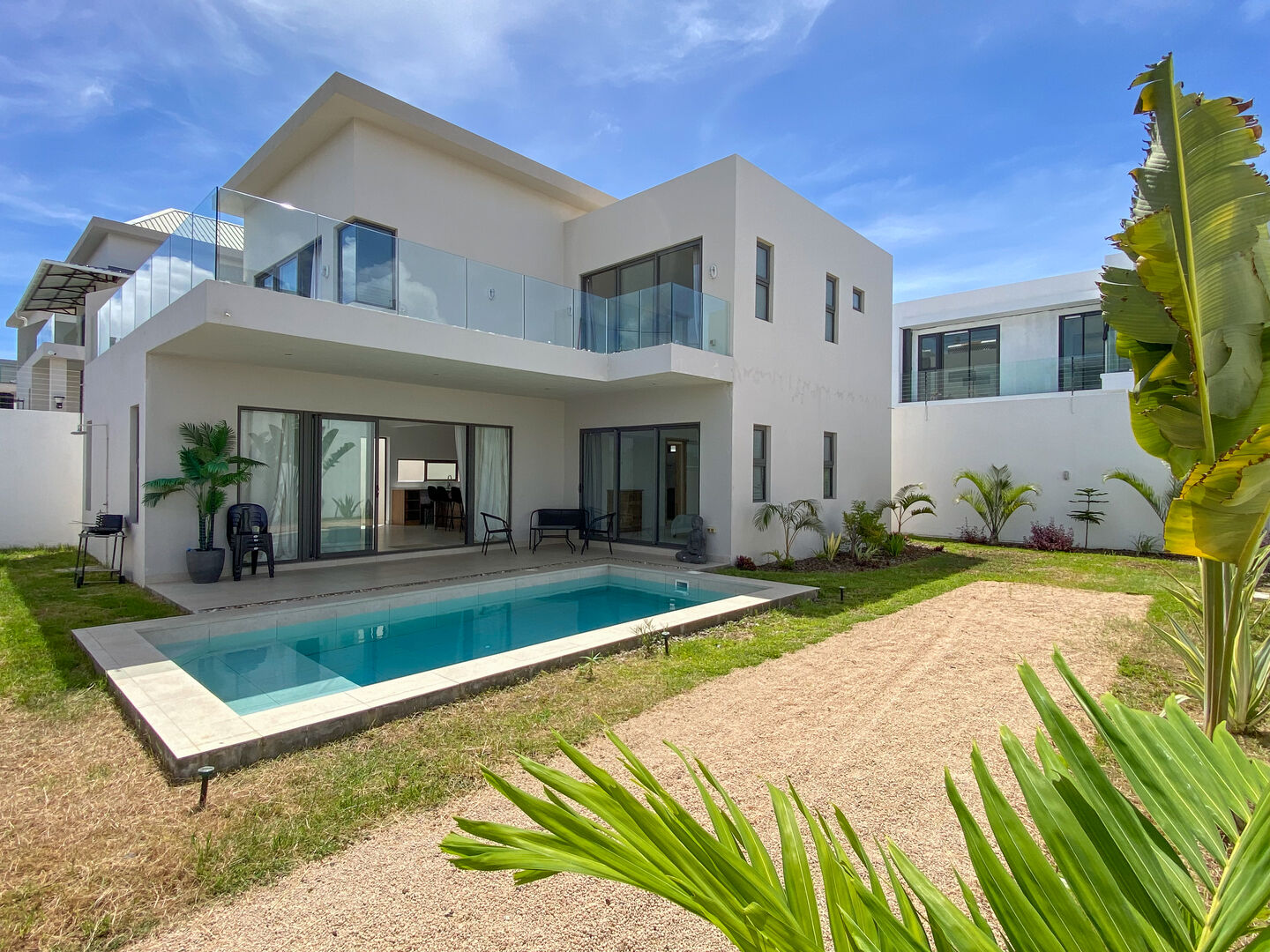 Villa à vendre de 172m² sur un terrain de 203m², 3 chambres en suite, 3 salles de bains, piscine privée, parking pour 3 voitures. Proche des commerces et de la plage. Entièrement meublée, climatisée, avec cuisine équipée. Prix : Rs 16 500 000. Réf : 86801564.