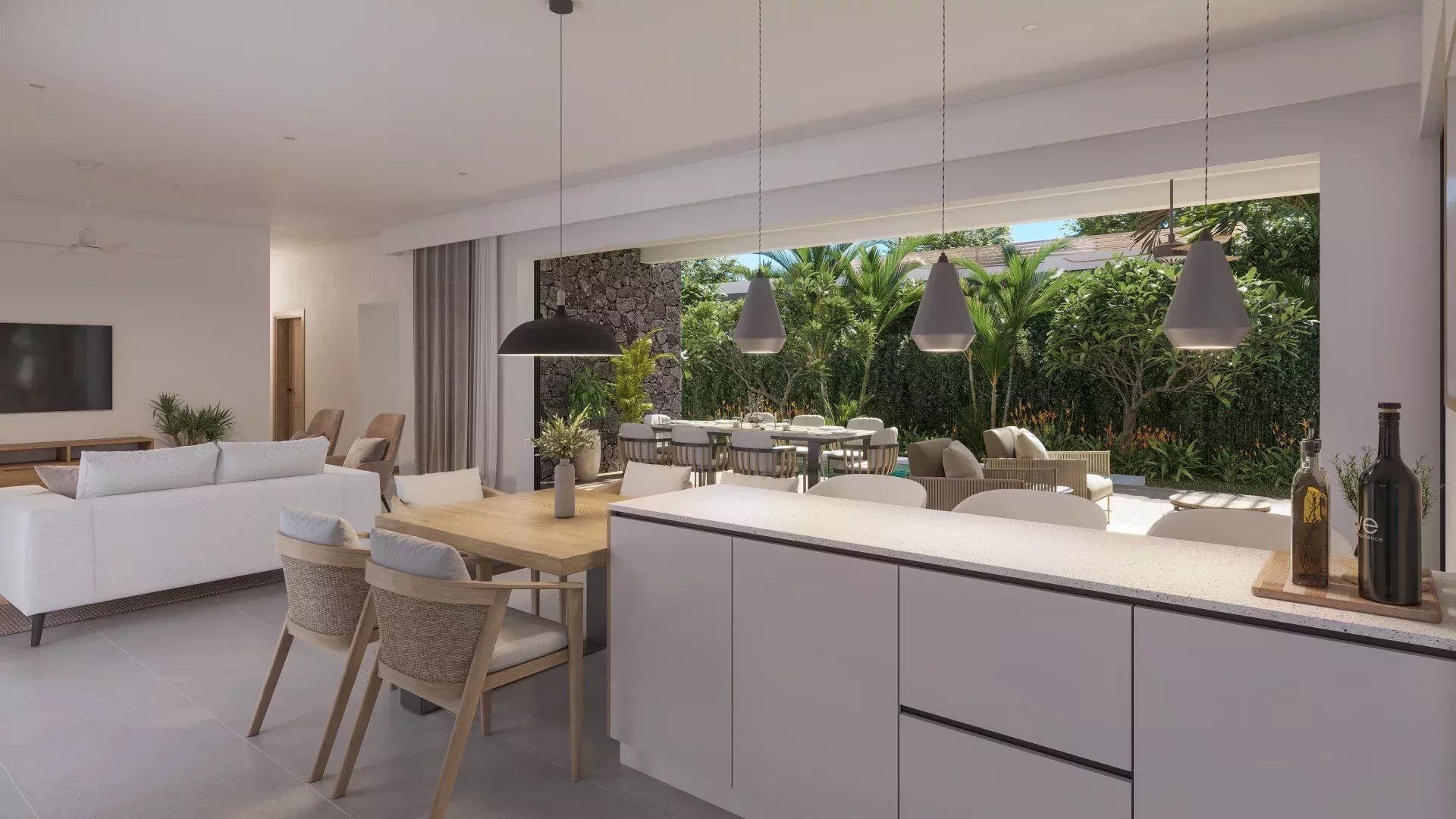 L’architecture met l’accent sur la fluidité des volumes, la luminosité naturelle et la continuité entre intérieur et extérieur. Le séjour s’ouvre largement sur la terrasse couverte et la piscine, créant une atmosphère à la fois conviviale et élégante. La cuisine ouverte avec arrière-cuisine accompagne un mode de vie confortable et fonctionnel, parfaitement adapté à un usage quotidien comme à la réception.
