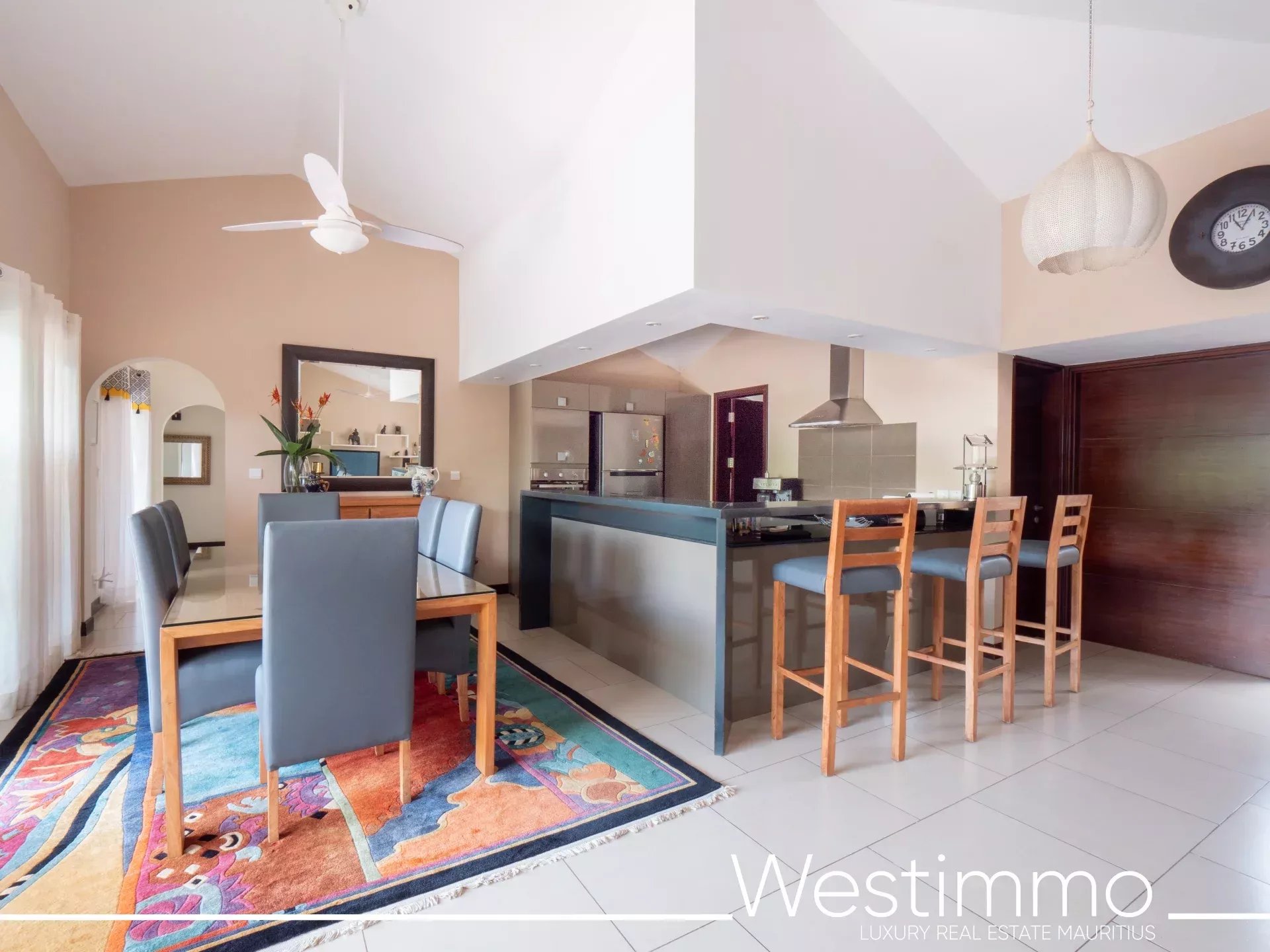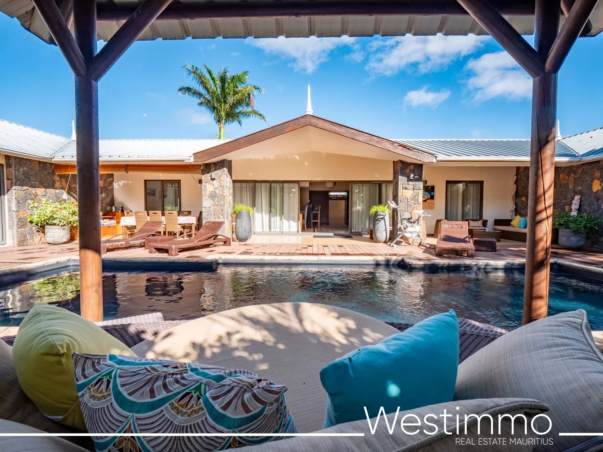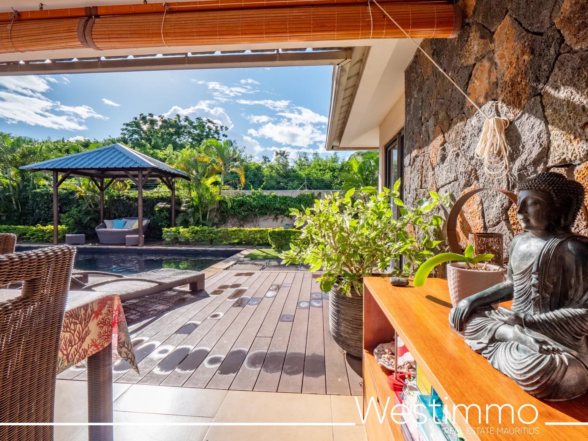 L’architecture de la villa privilégie une vie fluide, fonctionnelle et sereine, avec une organisation pensée pour le confort quotidien. Les volumes intérieurs réunissent un salon, une salle à manger et une cuisine spacieuse, complétés par une arrière-cuisine qui renforce la praticité de l’ensemble. L’ouverture vers la terrasse couverte de 43 m² permet de prolonger naturellement les espaces de vie vers l’extérieur, dans une logique parfaitement adaptée au climat mauricien. Cette relation harmonieuse entre intérieur et extérieur participe pleinement à l’atmosphère apaisante de la propriété.