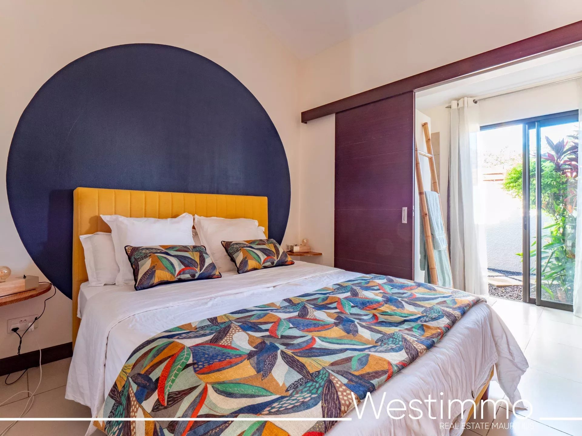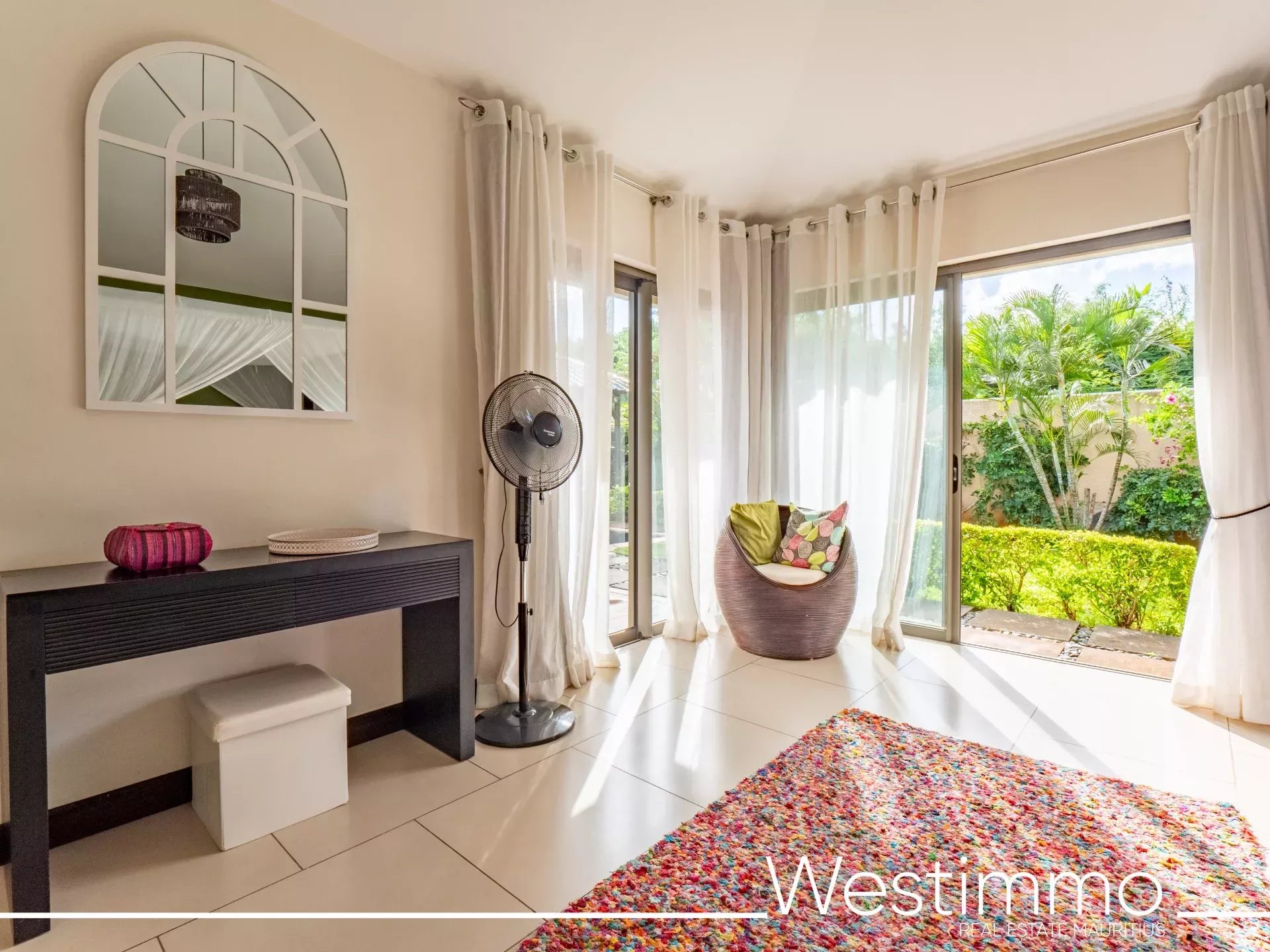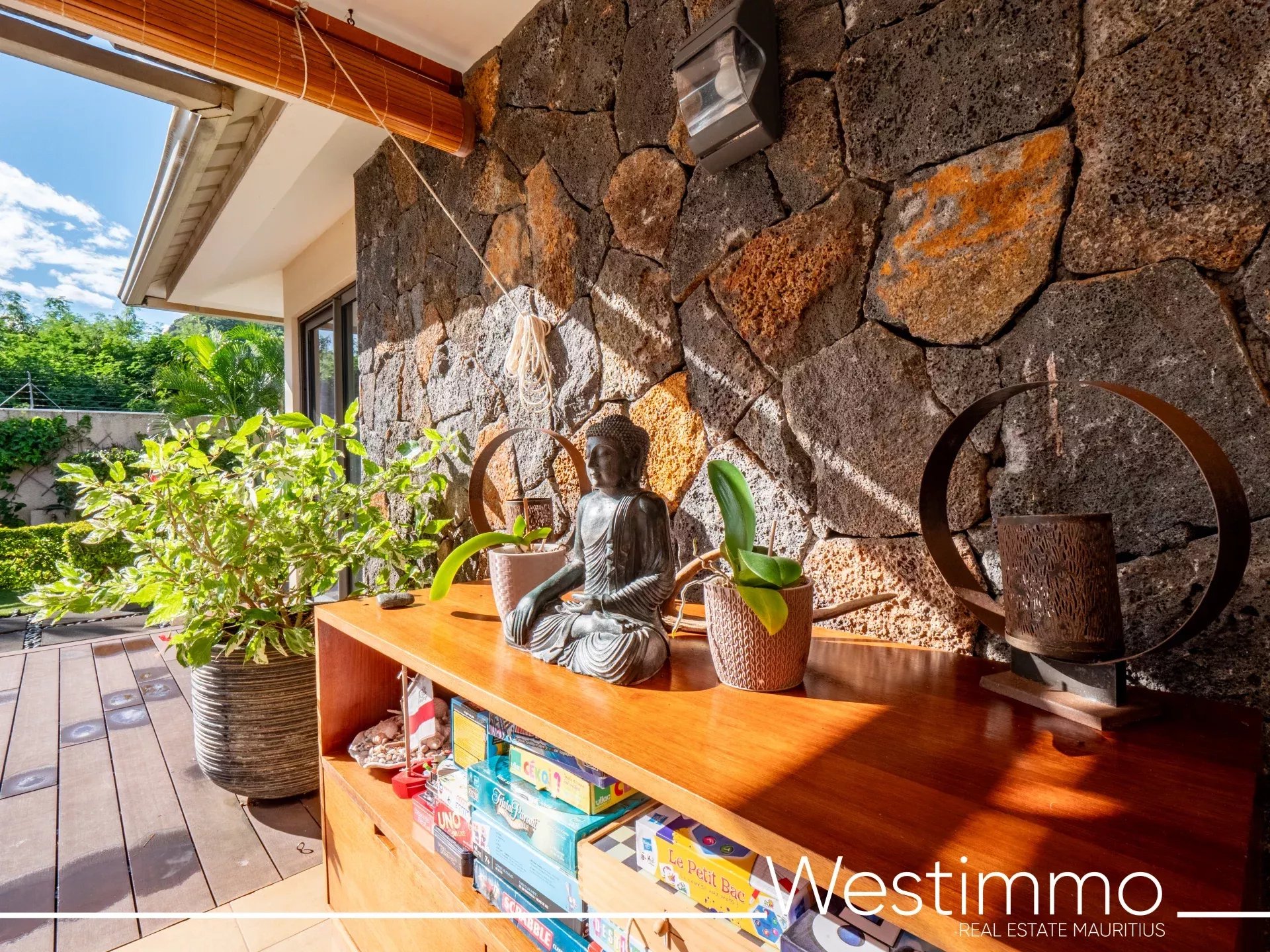 L’architecture de la villa privilégie une vie fluide, fonctionnelle et sereine, avec une organisation pensée pour le confort quotidien. Les volumes intérieurs réunissent un salon, une salle à manger et une cuisine spacieuse, complétés par une arrière-cuisine qui renforce la praticité de l’ensemble. L’ouverture vers la terrasse couverte de 43 m² permet de prolonger naturellement les espaces de vie vers l’extérieur, dans une logique parfaitement adaptée au climat mauricien. Cette relation harmonieuse entre intérieur et extérieur participe pleinement à l’atmosphère apaisante de la propriété.