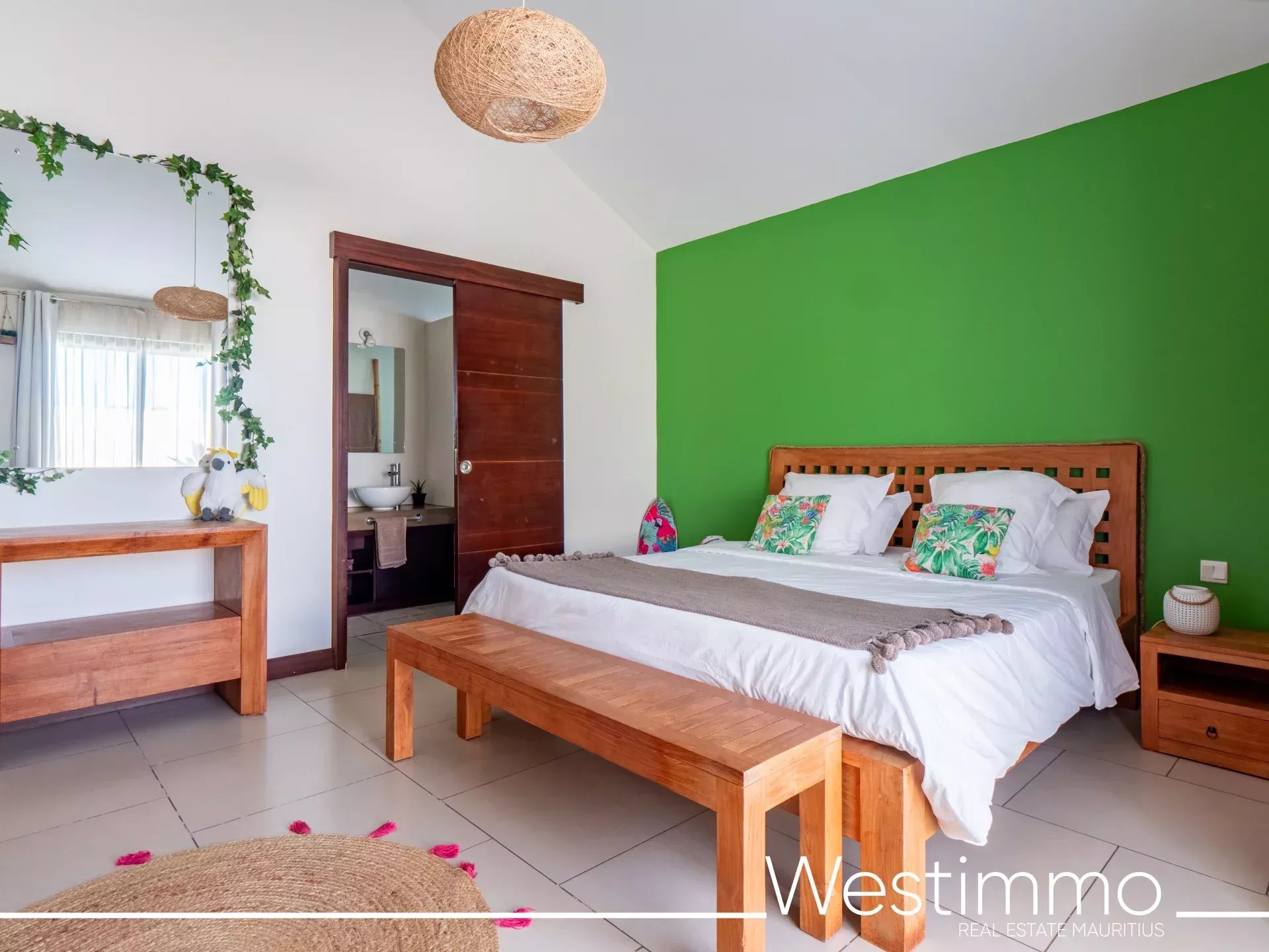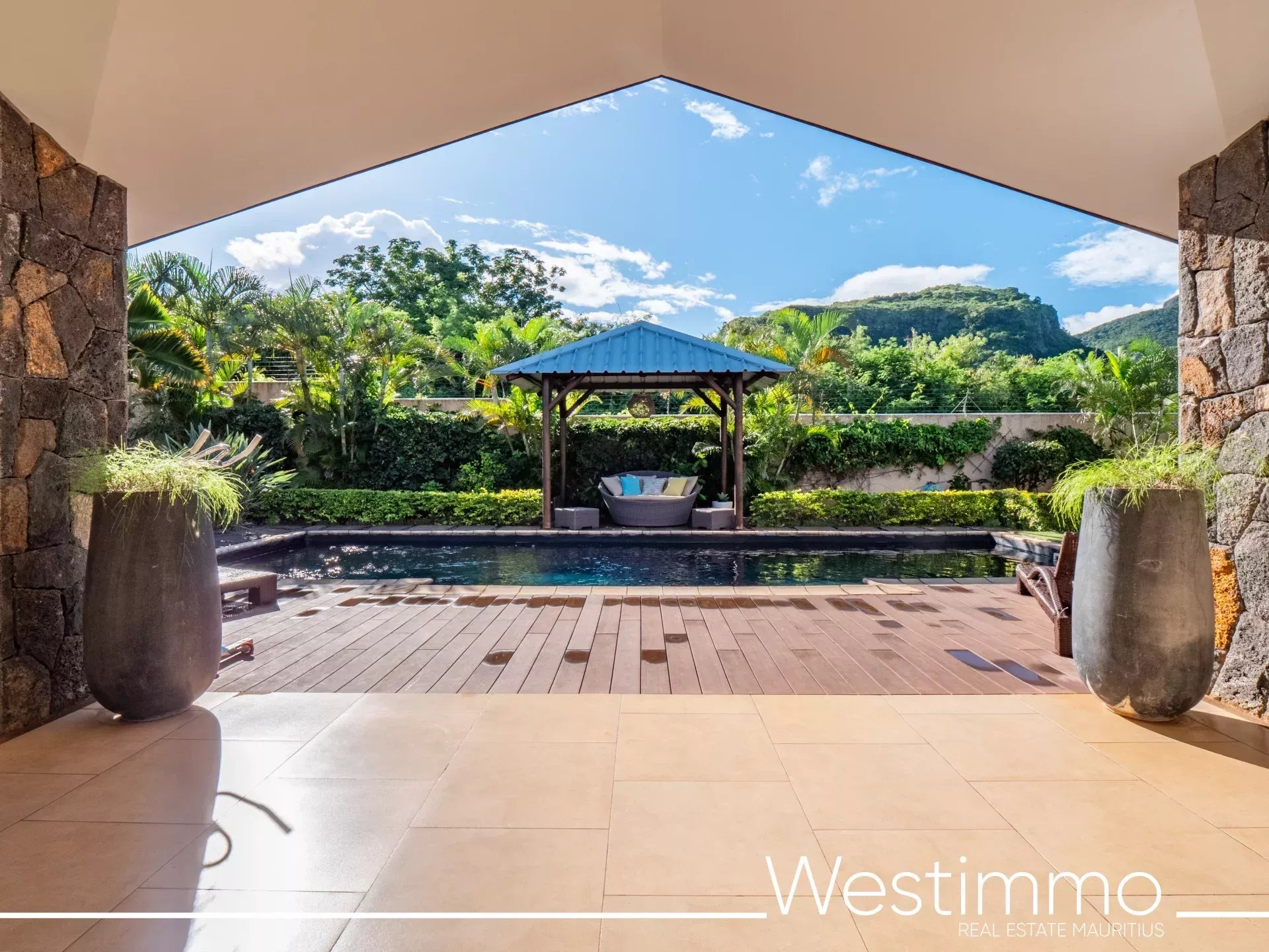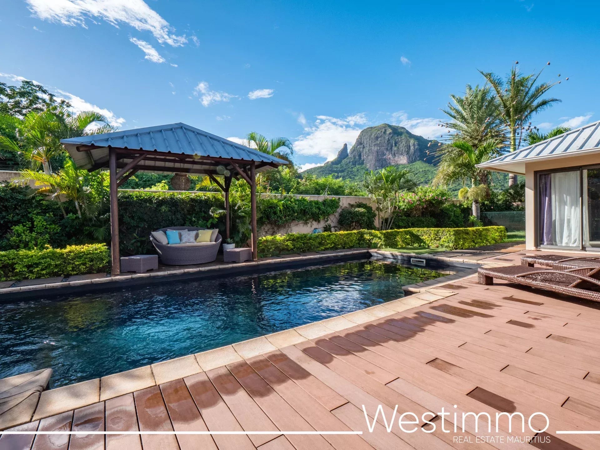 À vendre à l’île Maurice, cette villa de plain-pied située au cœur d’un domaine sécurisé de 13 villas offre une vue imprenable sur la montagne du Rempart et un cadre de vie particulièrement recherché. Accessible aux étrangers avec permis de résidence, elle développe 240 m² habitables complétés par 43 m² de terrasse couverte, avec 5 chambres dont 4 en suite, une piscine de 10 m et de beaux espaces de vie ouverts sur l’extérieur. Son implantation, son confort de plain-pied et la qualité de ses équipements en font une propriété rare sur le marché. Elle s’adresse aussi bien à une clientèle en quête d’une résidence principale de standing qu’à des acquéreurs recherchant un bien à potentiel locatif dans un environnement naturel et sécurisé.